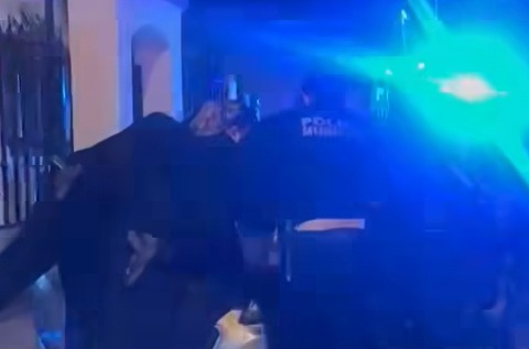 Una persona se acerca e intenta retirar a una de los oficiales y rápidamente se le van encima otros dos, acto seguido uno de los agentes saca su arma de cargo y realiza varias detonaciones al cielo para dispersar a las personas.