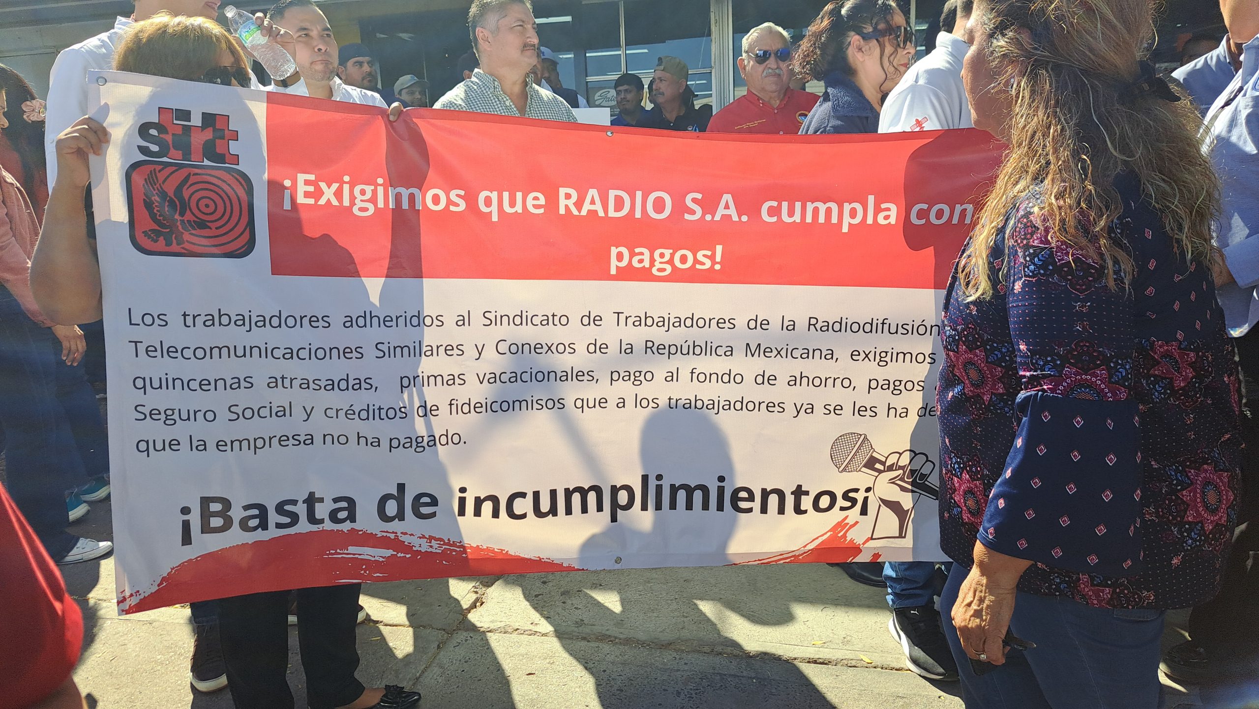 Los empleados administrativos y locutores de Radio SA se manifestaron para exigir el pago de sus quincenas atrasadas, primas vacacionales, fondo de ahorro e incluso de Infonavit pues hay a quienes se les han hecho llegar requerimientos pese a los descuentos que se aplican cada mes a su salario por este concepto.