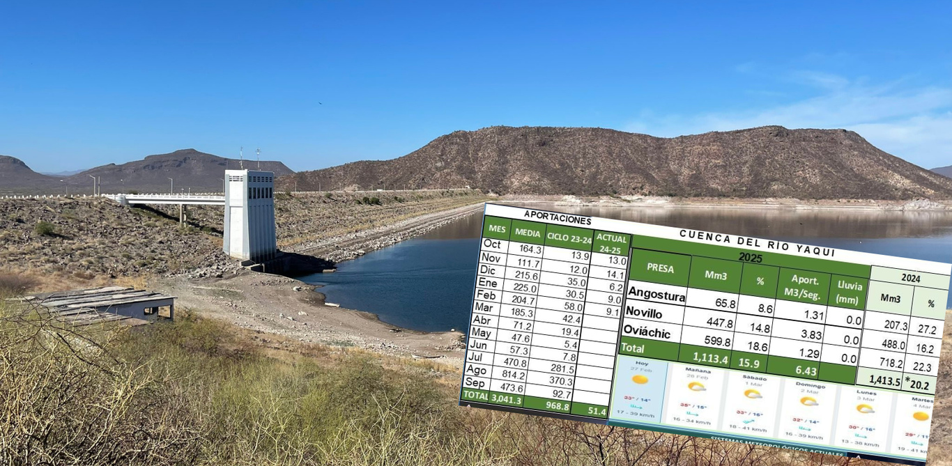 Actualmente el almacenamiento de las tres presas representa un 15.9% con mil 117.2 millones de metros cúbicos, para el Oviáchic la situación está en 18.6% almacenando 599.8 millones, con una media de apenas el 8.3 al mes de febrero, siendo la meta 204.7 mm3.
