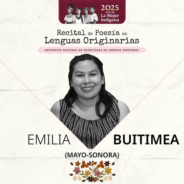 Cabe resaltar, que este importante Encuentro Nacional de Escritoras en Lenguas Indígenas, se realiza en el marco del Día Internacional de la Mujer y además de Emilia Buitimea, poeta en lengua Mayo, también participarán mujeres como Natalia Toledo, poeta Zapoteca, Ruperta Bautista, escritora en lengua tsotsil, Rubí Huerta poeta en lengua purépecha, Celerina Sánchez, poeta en lengua mixteca, entre otras.