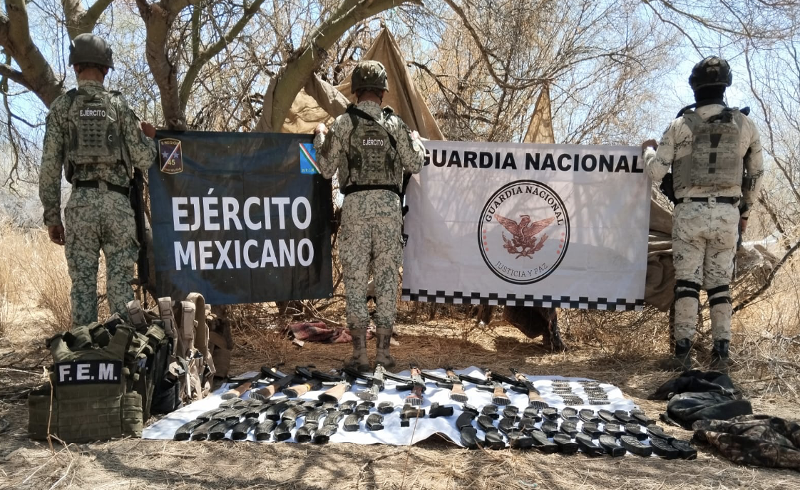 -En Trincheras, elementos del Ejército Mexicano y GN, en un camino de terracería, localizaron un campamento empleado por la delincuencia organizada, aseguraron nueve armas largas, dos armas cortas, 68 cargadores, 190 cartuchos y 10 chalecos tácticos.