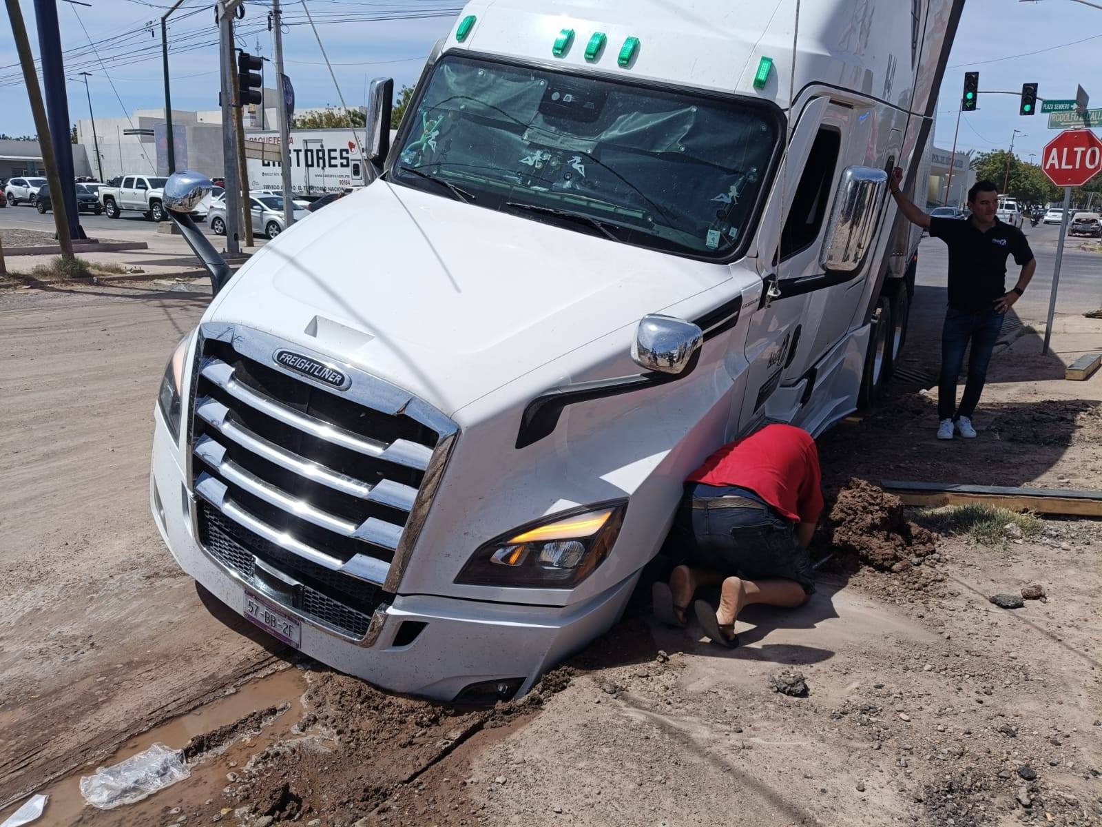 Cuando realizaba maniobras para incorporarse al carril, un tráiler se hundió en el suelo frente al Hospital del Niño y la Mujer (HNM) debido a las condiciones del pavimento.