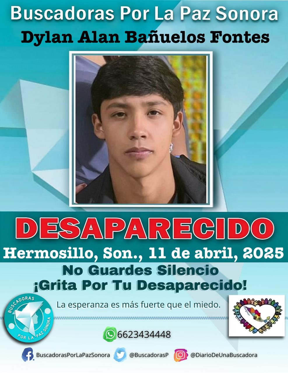 Si usted conoce el paradero de Dylan Alan Bañuelos Fontes de 15 años desaparecido el 11 de abril de 2025, puede llamar al seis 623-4344 48 con el colectivo buscadoras por la paz o al 911 número de emergencias.