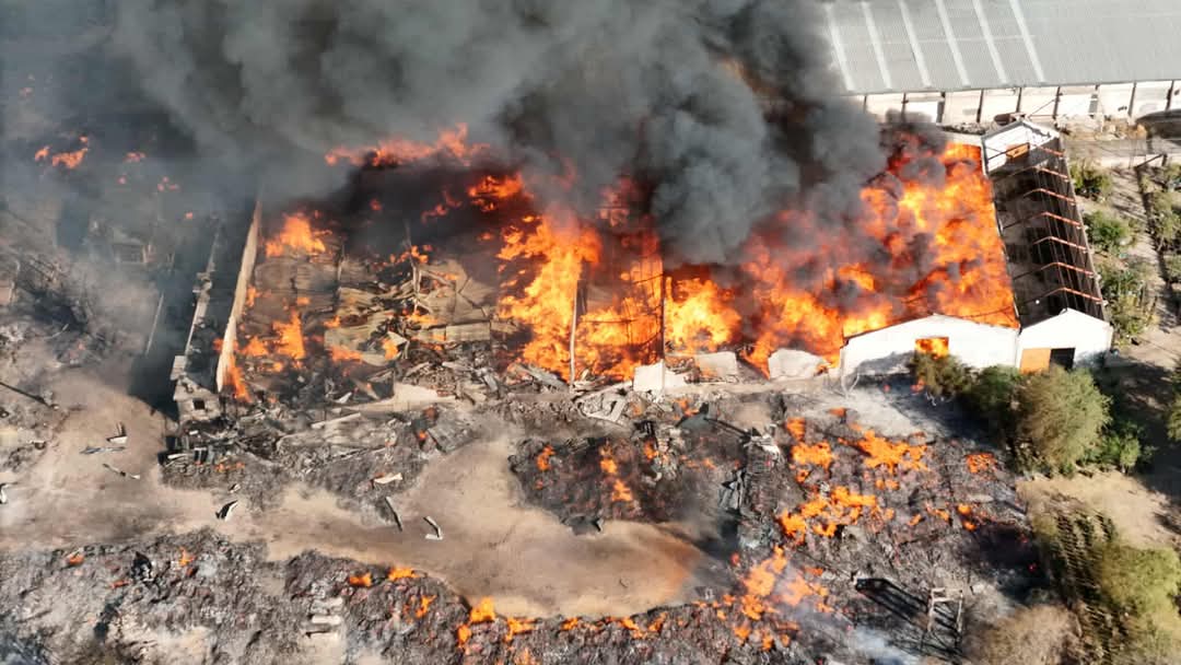 Al frente del predio, las primeras llamas ya trepaban por los muros y consumía pilas de tarimas de madera. Pero la verdadera amenaza estaba al fondo: cuatro hectáreas con más tarimas apiladas listas para recibir el fuego que devoraba todo a su paso.