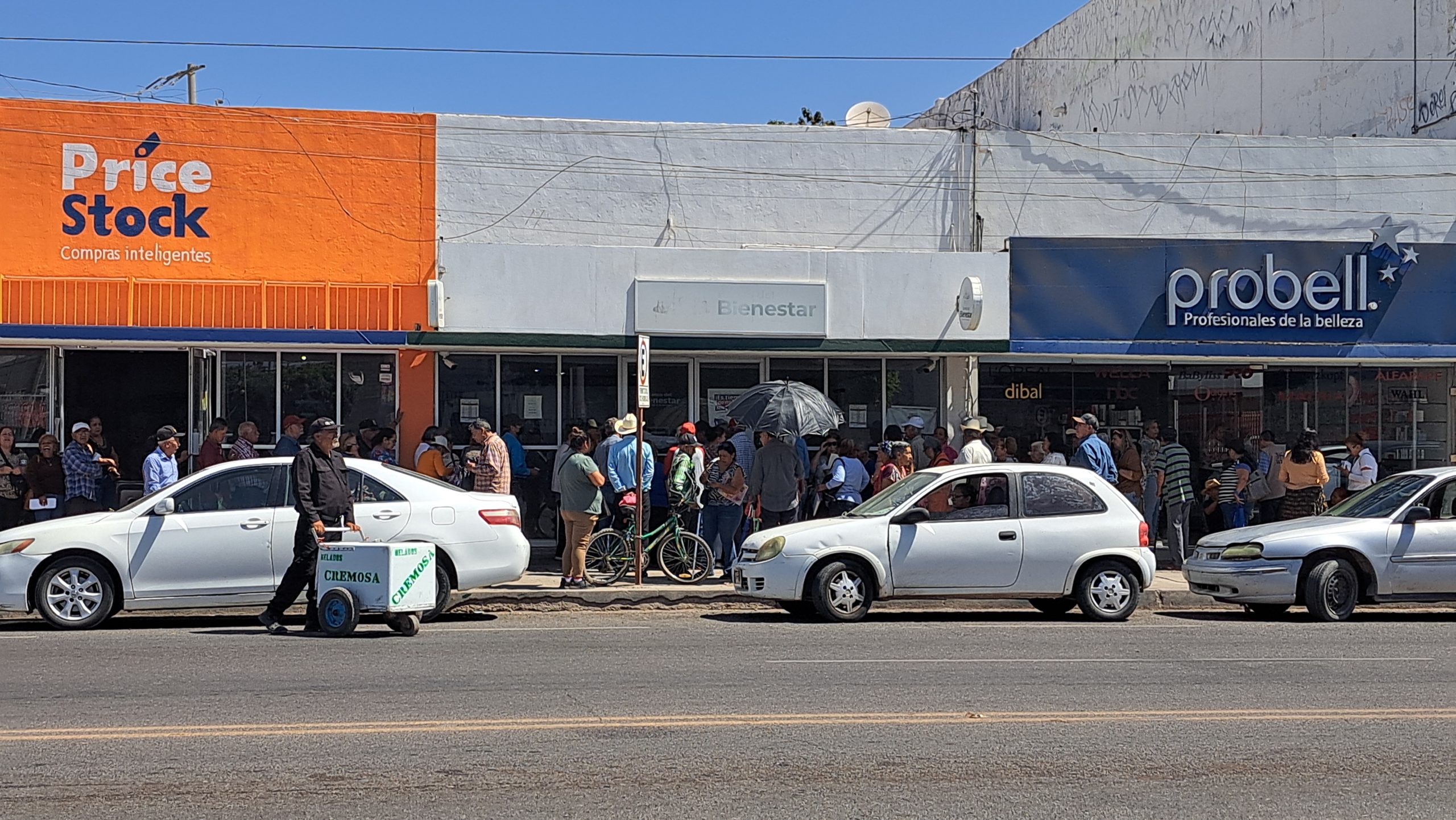 Desde muy temprano, comenzaron a formarse largas filas afuera del Banco del Bienestar en el Centro de Ciudad Obregón, debido al inicio de la dispersión de apoyos federales este 7 de mayo.
