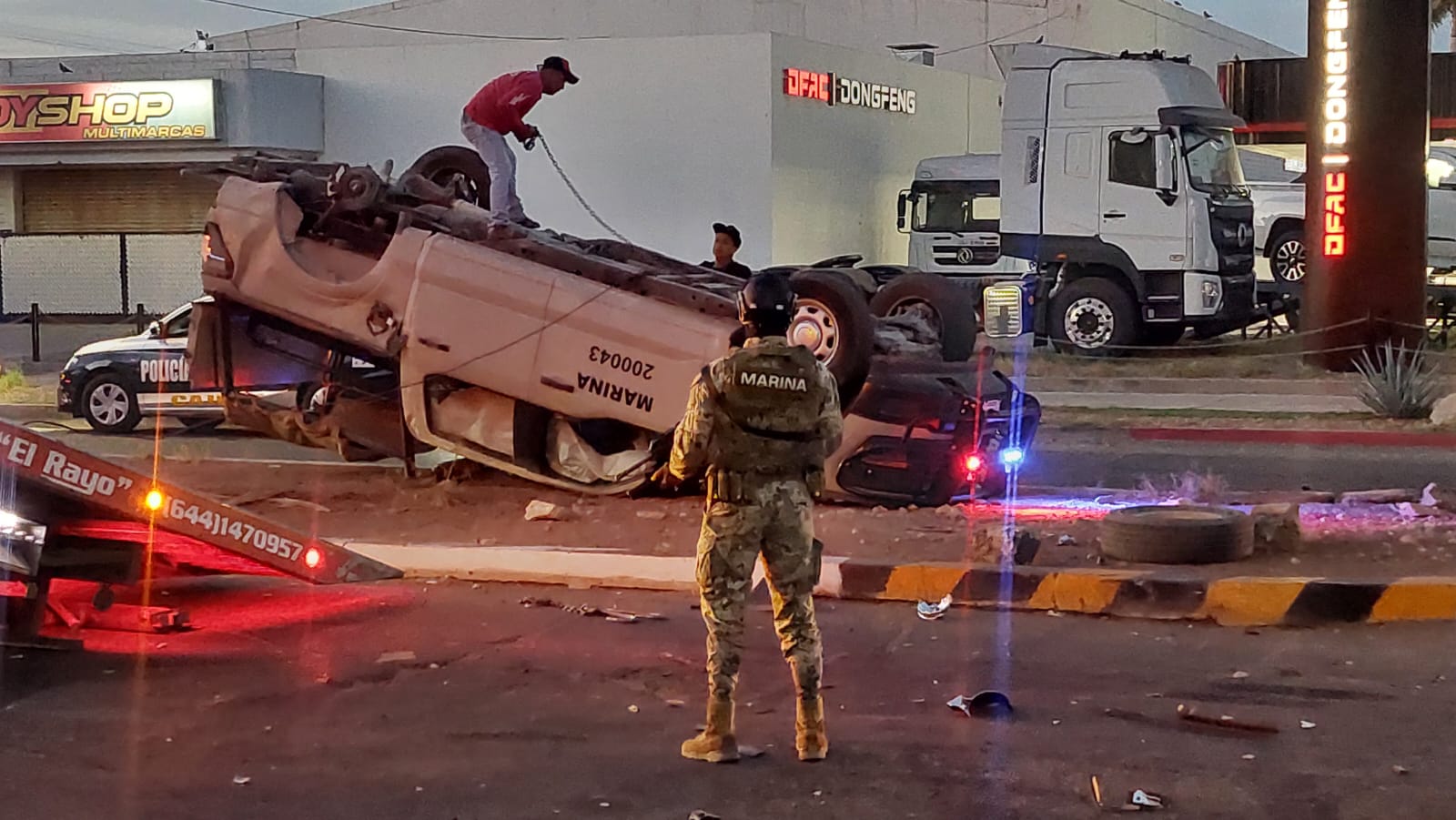 Durante la madrugada de este domingo, se registró una aparatosa volcadura en el cruce de las calles Miguel Alemán y Morelos, en la colonia Centro de Cajeme, que dejó como saldo varios lesionados, entre ellos elementos de la Secretaría de Marina.