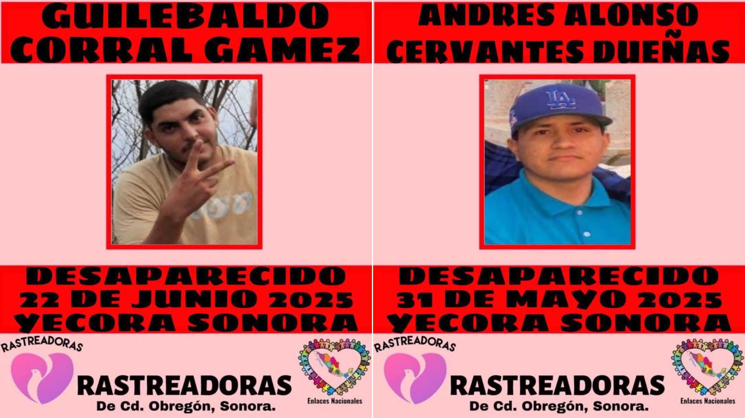 Andrés Alonso Cervantes Dueñas desapareció el 31 de mayo, mientras que Guilebaldo Corral Gámez fue reportado como extraviado el 22 de junio.