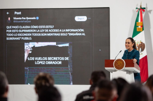 La mandataria exhibió como ejemplo un reciente mensaje en redes sociales del expresidente de la República y militante del Partido Acción Nacional, Vicente Fox Quezada, “diciendo mentiras”, en el que publicó que el presidente López Obrador realiza “vuelos secretos cada semana”, sin presentar prueba alguna.