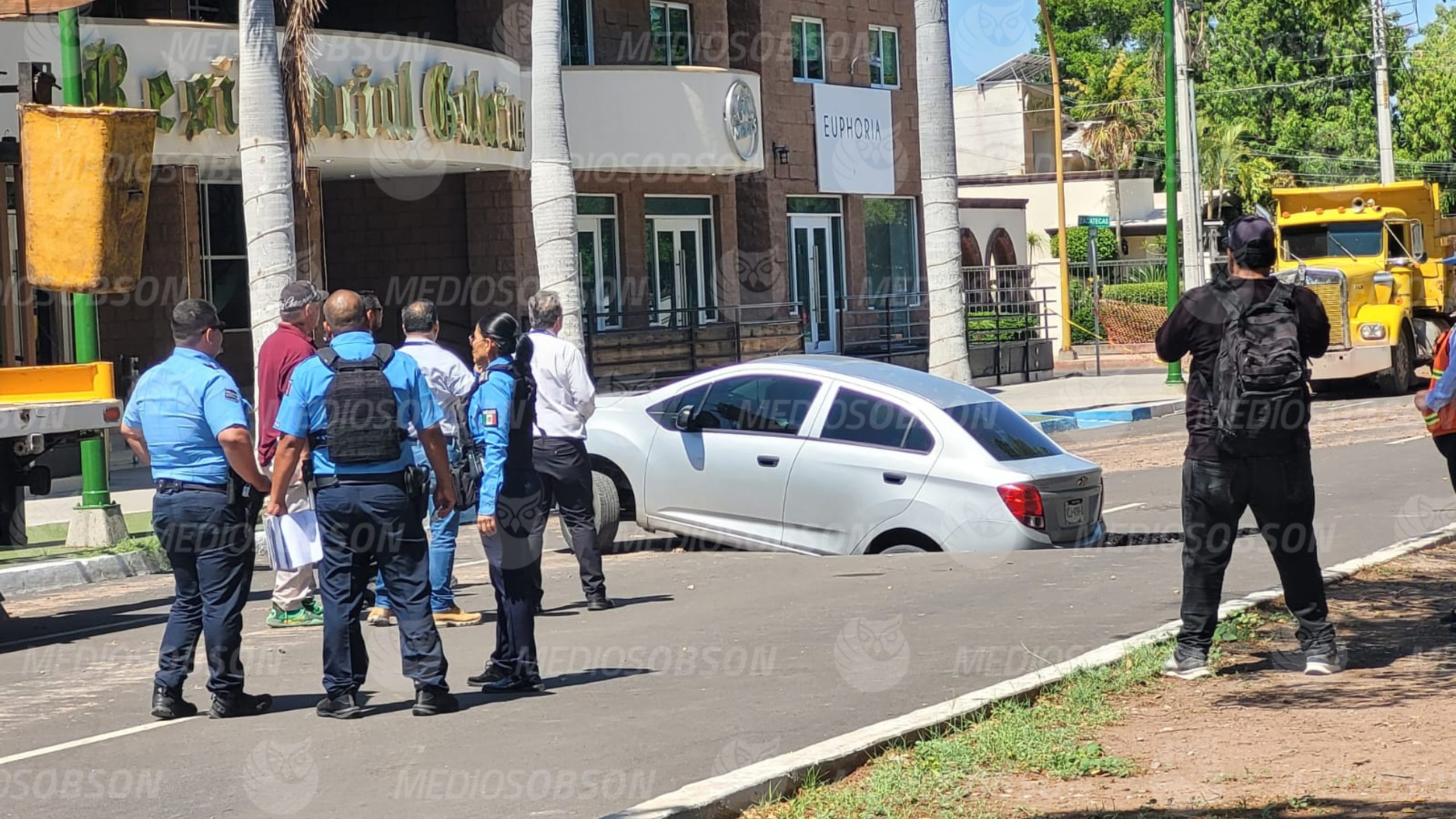 Debido a la falta de precaución, un automóvil de servicio de plataforma digital cayó a profundo socavón frente a conocida hospedería de la zona norte.