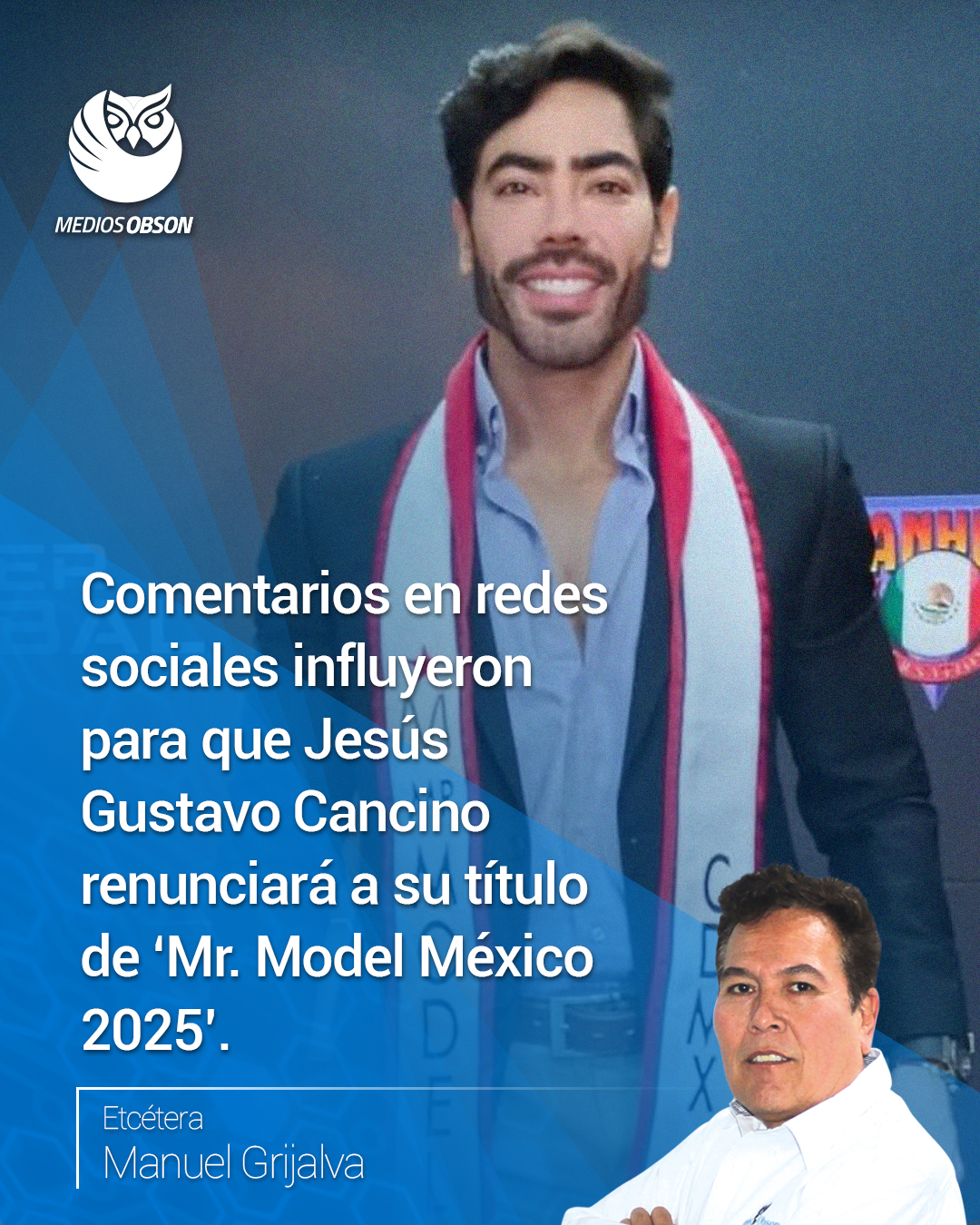 Los guapos dejamos que la almohada decida qué peinado tendremos en la mañana… Tan solo porque se burlaron de él en redes sociales, el chavo que hace unos días ganó el título de ‘Mr. Model México 2025’ tuvo que renunciar a sus sueños de representarnos en Tailandia, país que en septiembre de este año será anfitrión del certamen internacional, su nombre es Jesús Gustavo Cancino, tiene 29 años de edad, mide 1.82 de estatura, en sus ratos libres le gusta jugar pádel y montar a caballo, aunque en este certamen de belleza representó a la Ciudad de México, él es originario de Tapachula, Chiapas, además de ser modelo, es cirujano plástico y dueño de su propia clínica estética en la CDMX… tras vivir momentos de emoción y felicidad, el nuevo ‘Mr. Model México 2025’ tuvo que renunciar a su nombramiento, pues muchos internautas no estuvieron de acuerdo con su triunfo y es que muchos de ellos descubrieron que su clínica era patrocinador oficial de dicho certamen, por lo que sospechan que hubo ‘mano negra’, además de que a muchos les pareció que él era ‘más plástico que humano’… ‘tiene más rellenos que una almohada de hotel’, ‘barba teñida, labios inyectados y sonrisa de influencer… ¿ese es el nuevo hombre mexicano?’, ‘había mejores candidatos, ¡y más naturales!, Veracruz, Oaxaca, Michoacán, ¡ni hablar!’, son solo algunos de los muchos comentarios que influyeron para que Cancino renunciará a su título de ‘Mr. Model México 2025’… fue debido a que se lo comieron en redes sociales con tan nefastos comentarios que quien fuera reconocido como el ‘hombre más bello y sexy de toda la república mexicana’ renunció a sus sueños de triunfar a lo grande en las pasarelas internacionales, como quien dice, tuvo miedo de traerse a México el título y la corona de ‘Míster International 2025’ y de ser reconocido como el ‘hombre más bello del mundo’, convirtiéndose con ello en el primer concursante varón en renunciar de manera voluntaria a sus sueños… quien ahora representará a México en el certamen internacional es el veracruzano Willy Inurreta Del Cueto Alejandro Ávila, él tiene 21 años de edad, mide 1.86 de estatura, cursa el sexto semestre de la carrera de Nutrición, se desempeña como masajista deportivo, entrenador de artes marciales y entrenamiento funcional, a los dos se les desea la mejor de las suertes en sus vidas futuras… Aunque suene imposible, los guapos y los inteligentes si existimos… Los boletos para reír a carcajadas con ‘Güevos Rancheros’ se encuentran ya a la venta en Arema Ticket y en el hotel Wyndham Garden, estos tienen un valor de 550 los VIP, 450 los Preferentes y en la zona General 350 pesos, precios bastantes accesibles para que ningún cajemense se quede sin ser parte de las celebraciones del 30 aniversario de esta divertidísima puesta en escena que es estelarizada por el señorón Irineo Álvarez… una noticia importante que les quiero compartir es que Paulo Sergio Galindo, – que es uno de los actores que participan en Güevos Rancheros’, – también lo podemos ver en ‘Sin querer queriendo’, él interpreta a ‘Paco’, quien es otro de los hermanos de Roberto Gómez Bolaños, serie que está dando mucho de qué hablar, así que no se queden sin ir a conocerlo el domingo 24 de agosto, fecha en la que los ‘Güevos Rancheros’ estarán presentándose en punto de las 8 de la noche en el Teatro del ITSON… Es bueno dejar la bebida, lo malo es no acordarse dónde… Etcétera…
