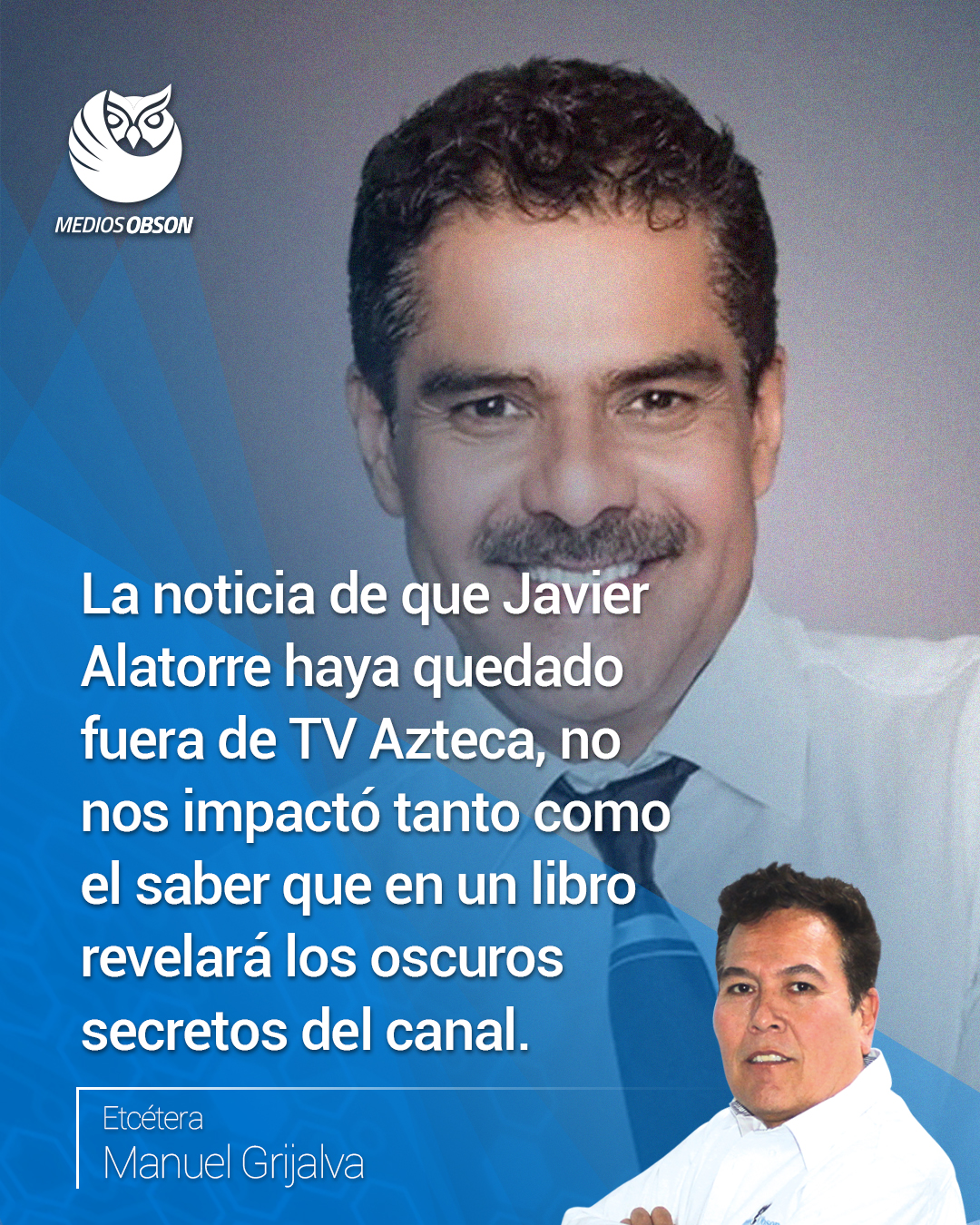 Hay que creernos capaces de todo, si no, no vamos a lograr nada… La noticia de que el conductor o presentador de noticias Javier Alatorre haya quedado fuera de TV Azteca, – en donde por 30 años lo vimos y escuchamos dándonos a conocer las noticias más relevantes del momento, – no nos impactó tanto como el saber que presentará un libro en donde según se dice, revelará los oscuros secretos del canal que por tres décadas le dio de comer y lo lanzó a la fama y es que su salida del noticiero no fue voluntaria, razón por la que el comunicador de 64 años nacido en la ciudad de Navojoa se encuentra sumamente molesto con la decisión que altos ejecutivos de Azteca tomaron de sacarlo del aire… creo que Alatorre mejor debería de relajarse y disfrutar sus últimos años de vida, con soltar la sopa no ganará nada, sino al contrario, si es verdad lo que se dice, su vida estará en peligro y es que a nadie le agradará ser exhibidos así como él lo planea hacer, ya que en el libro que planea lanzar a la venta hablará de la corrupción de varios políticos y de las manipulaciones informativas que le tocó presenciar o ser parte… dinero no creo que le falte, pues por 30 años estuvo al frente del noticiero estelar de TV Azteca, es lógico creer, pensar o suponer que fue uno de los que recibía el mejor salario, por lo que recibirá bastantes millones de pesos por su despido injustificado, pero pues ya era hora de que pensará en la jubilación, si con lo que le den no le alcanza, pues que tramite su tarjeta Inapam o se dé de alta para que reciba el apoyo que el gobierno da a los adultos mayores, ¡ya está en edad!… ¿o es que acaso planeará seguir los pasos de María Antonieta de las Nieves de 75 años y de Carlos Villagrán de 81?, quienes a pesar de que casi no se pueden mover, ni hablar, los veteranos actores siguen empeñados en darle vida a ‘La Chilindrina’ y a ‘Kiko’, personajes con los que saltaron al estrellato en sus años de juventud… en su mensaje de despedida, Javier Alatorre dijo que ‘él se manda solo’, ¿qué habrá querido decir con eso?… A diferencia del dinero, el tiempo no puede ahorrarse para aprovecharlo en otro momento… De estar en el sexto lugar, banda ‘El Recodo’ de don Cruz Lizárraga en un abrir y cerrar de ojos llegó al primerísimo puesto de la lista Regional Mexican Airplay de Billboard con ‘No me aprovechaste’… Son los mismos músicos de ‘La madre de todas las bandas’ quienes agradecen a todos sus seguidores por haberlos llevado al primer puesto de tan selecta lista, reconociendo que son ellos quienes son su inspiración, por lo que es gracias al cariño y al apoyo que día a día les entregan es que se esfuerzan por ser mejores músicos, cantantes y seres humanos… Siempre existirán los que dan y los que reciben, pero solo los primeros dormirán mejor… No olviden que en la noche del viernes 5 de septiembre en la ‘Explanada Obregón’ se celebrará el tan esperado ‘Bikers Fest Aztec Riders Mc Aniversario’, evento en el que estarán presentándose ‘Genitallica’, ‘Element’, ‘S-Tella’ y los ‘Madafakers’… la banda estelar de este evento será nada menos que ‘Genitallica’, – ícono del rock regiomontano, – ellos llegarán hasta acá con su explosiva gira llamada ‘Más Alcohol Tour 2025’, prometiendo un show inolvidable con sus temas clásicos y nuevos himnos cargados de energía… como falta ya un mes para que se llegue tan esperado día es que los boletos de 350 pesos ya se encuentran a la venta en ‘Tridente Rock Store’, – ubicado en 6 de Abril y Puebla, en la colonia Centro, – mientras que las mesas para 4 personas con un valor de 3 mil pesos los pueden adquirir mediante un mensaje al WhatsApp al 644 231 1756…. Hay que creernos capaces de todo, si no, no vamos a lograr nada… Etcétera…