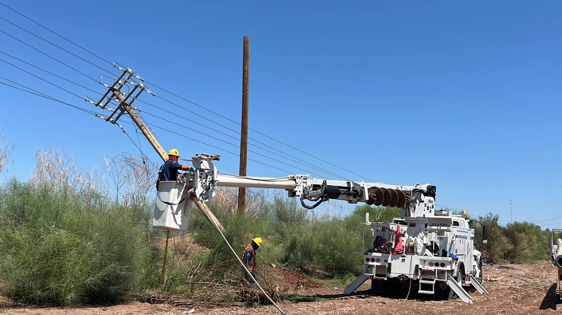 Los vientos de hasta 55 k/h que se registraron la tarde del martes provocaron que al menos dos postes de electricidad se cayeran sobre la calle Meridiano en el Valle del Yaqui, al lugar acudió personal de CFE a realizar labores de reparación.