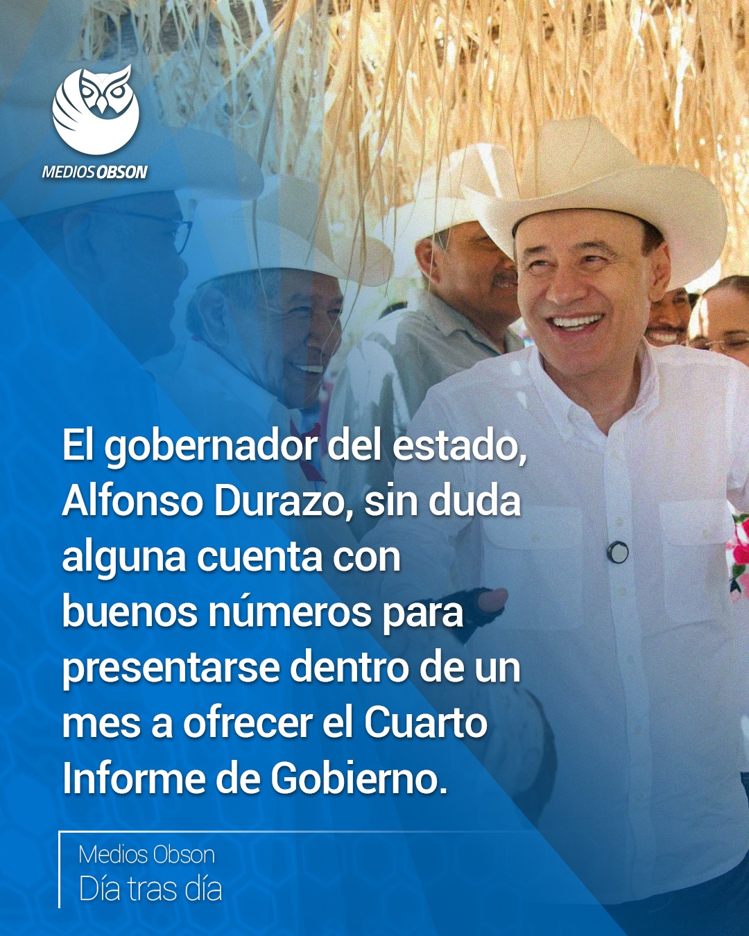 El gobernador del estado, Alfonso Durazo Montaño, sin duda alguna cuenta con buenos números para presentarse dentro de un mes a ofrecer el Cuarto Informe de Gobierno, al frente de los destinos de Sonora, sobre todo en temas económicos donde los resultados han sido positivos. Y es que reducir la pobreza en mas de un 15 por ciento no es fácil, porque estamos hablando de casi medio millón de sonorenses que dejaron de vivir en la pobreza e incluso en la pobreza extrema. Indudablemente que el mandatario ha conseguido esto con constancia en el trabajo y el ejercicio de políticas económicas adecuadas, teniendo como estratega rectora el Plan Sonora de Energías Sostenibles. Dicha reducción de la pobreza era de esperarse, pues durante el año, el mismo Instituto Nacional de Estadística Geografía e Informática (Inegi) colocaba a Sonora con datos estadísticos muy positivos, ubicando a la entidad en los primeros lugares en crecimiento industrial, familias con mejor ingreso promedio, crecimiento de la economía local, crecimiento en las exportaciones, disminución de la desigualdad, entre algunos otros indicadores que dan como resultado una economía fuerte, generadora de empleo. A esto se le suman programas de gobierno encaminados a mejorar la calidad de vida de las personas, como el del fortalecimiento económico a familias vulnerables, Becas Sonora de Oportunidades, apoyos a personas de la tercera edad y personas con discapacidad. Así mismos la atracción de proyectos en el marco del Plan Sonora, que han derivado en proyectos como la modernización del Puerto de Guaymas, la constricción de nuevos hospitales en todas las regiones del estado, ampliación y mejoramiento de aeropuertos. Así que estoy mas será lo que escucharemos en el Cuarto Informe de Trabajo del mandatario sonorense.