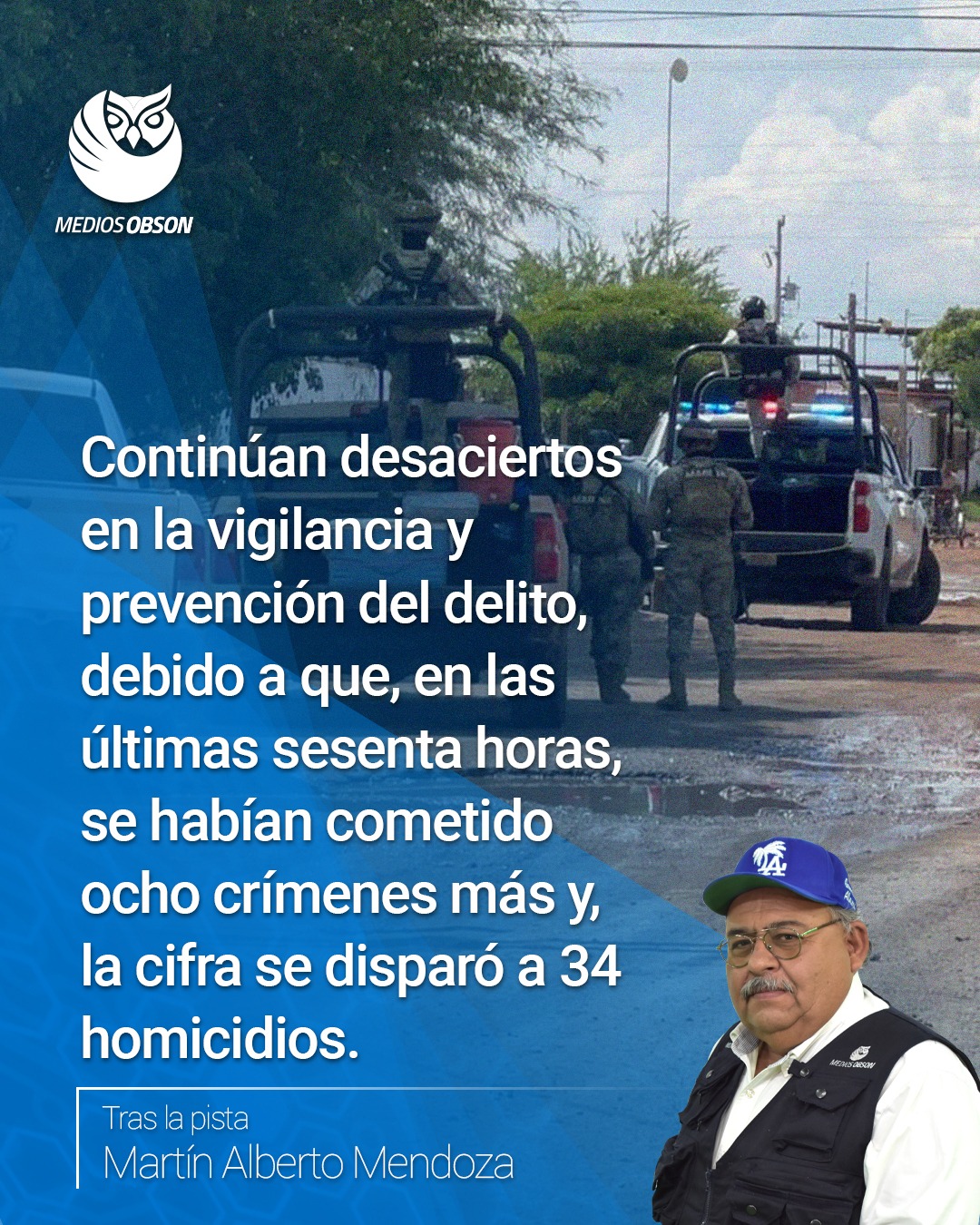 CONTINÚAN desaciertos en la vigilancia y prevención del delito, debido a que, en las últimas sesenta horas, se habían cometido ocho crímenes más y, la cifra se disparó a 34 homicidios hasta las diez de la mañana de este domingo. Insistimos en que resulta inexplicable, el por qué ninguna corporación o institución armada como Marina, Ejército y Guardia Nacional, muestren capacidad para asestar un tiro de precisión, que consista en capturar en flagrancia delictiva a generadores de violencia, como ahora llaman a asesinos. Llevan largos meses, que no evitan una ejecución o capturan a especímenes en pleno acto criminal. ¿Compromiso o temor? Vaya usted a saber, pero tampoco atoran a nadie en plena huida, tras dar muerte a una o más personas. Absolutamente nada de esto. Resulta increíble creer que no se den cuenta de su presencia. Mucho se ha insistido en que no estamos en una gran urbe o metrópoli, cuya densidad demográfica se los impida. Es decir que habitemos enorme ciudad, por lo que no nos queda más que coincidir con el escrutinio público, en el sentido de que no existe voluntad y mucho menos interés por atrapar a esa gente. Como referente, tenemos el caso del doble homicidio ocurrido a plena luz del día y en céntrica demarcación, como es la Sinaloa entre Allende y Náinari. No es posible que, ante el caudal de unidades policíacas y militares nadie haya escuchado el rugir de los motores de ambos carros. El que abordaban los hombres que murieron masacrados y el de los gatilleros. Aunado al rechinido de llantas y para terminar el estruendo de las ráfagas. Sucedió a escasos metros de una de las avenidas más transitadas de Ciudad Obregón como es la Miguel Alemán, donde el vaivén de unidades policiales y artillladas de la tropa castrense es constante. Pero, dónde está Claudio Cruz Hernández y su director operativo, Erick Gabriel Campos González. ¿Qué hacen? ¿No les dará pena ser un cargo inútil para el erario público?, porque aun y cuando los occisos hayan andado mal, autoridades no tienen por qué permitir que nadie le arrebate la vida a ningún ser humano, como si estuviéramos en la selva. De qué demonios sirve que los gobiernos de todos los niveles destinen recursos para la seguridad pública, sí en realidad no se cumple y tampoco se hace nada en términos reales, para preservar y salvaguardar el cuidado de la ciudadanía, así de sencillo…SOLO COMO remembranza, el viernes además de la muerte de dos hombres a bordo de un automóvil que quedó sobre la banqueta del lado oriente de la Sinaloa, a temprana hora ya habían ultimado a tiros a vecino de la colonia Maximiliano R. López, por la calle Lirios, poco antes de las 7 de la mañana. Más tarde, en una privada de la Nueva Palmira, el colectivo que lidera Silvia Velázquez Rodelo, encontró en una fosa clandestina los restos de una mujer, que tenía la cabeza enteipada. A decir de la activista social que, ha aprendido bastante en cuestiones periciales, se estima que la fémina ya llevaba cerca de tres años enterrada en el traspatio de una vivienda, de la que se dice que uno de sus moradores igualmente fue desaparecido y no se volvió a saber nada de él. De momento, no se tiene datos de la mujer, por lo que ya se difundió la vestimenta que traía, al igual que las características de las sandalias, para que en dado caso de alguien tenga ausente a una familiar con ropas similares, todo es cuestión que vaya a las instalaciones del Centro Integral de Procuración de Justicia a Jalisco y Yaqui, y si no han hecho la denuncia ante el Ministerio Público hay que comenzar por hacerla y más delante acudir al departamento de Periciales para que les tomen muestras sanguíneas. Hay que decir que con este hallazgo ya suman setenta y seis los que han hecho las Guerreras Buscadoras, en solo siete meses y medio de este 2025, cuando el año pasado localizaron cincuenta y seis osamentas, pero en doce meses. Esto, indica que el quehacer de las búsquedas crecido en cerca del cincuenta por ciento. Ese mismo viernes, pero en la noche, en los Amaneceres dos, un adolescente murió acribillado con ráfagas de un fusil AK 47 cerca de las ocho de la noche. Hasta ahí concluyó la jornada con cinco muertes violentas. El sábado, alrededor de la media noche por la Cárdenas en la Luis Donaldo Colosio fue inmolado a tiros otro individuo. El ataque fue reportado a la altura de la Cuauhtémoc, pero en realidad fue más hacia el norte…Y EN ESA vorágine de ejecuciones, ayer, cerca de las 9:30 horas, en colonia El Rodeo, en la parte sur de la ciudad, al oriente de Valle Dorado. Se registró otra agresión que dejó sin vida a una mujer de 25 años, Se llamaba Alejandra. A decir de sus vecinos dejó en orfandad a dos niños de cuatro y seis años. Comentan que ambos fueron testigos de la muerte de su joven progenitora. Al Hospital IMSS Bienestar fue llevado en estado comatoso, Agustín, de 22 años, quien minutos más tarde expiró, pese a los esfuerzos médicos urgenciólogos, convirtiéndose en la víctima número 34 de agosto. Su deceso sobrevino cuando se hallaba bajo custodia de agentes de la Policía Municipal, por lo que ipso facto la medida quedó sin efecto…RECIENTEMENTE estuvieron a 225 kilómetros al sur de Obregón, los grupos especiales de la Secretaria de Seguridad Pública y Protección Ciudadana (SSPC), los llamados “Harfuch”, ya que son encabezados por el titular de esa dependencia federal, Omar García Harfuch, específicamente en Los Mochis, Sinaloa, donde implementaron sigilosos operativos que redundaron en la captura de algunos objetivos prioritarios criminales. Habría resultado prolífico que se hubieran descolgado de una vez a este jirón de la patria sonorense y apagaran las elevadas lenguas de fuego de violencia, en que estamos envueltos, en una batalla que no parece tener fin. Quizás habrían obtenido notables resultados que permitieran atenuar la elevada criminalidad que nos agobia. Se e