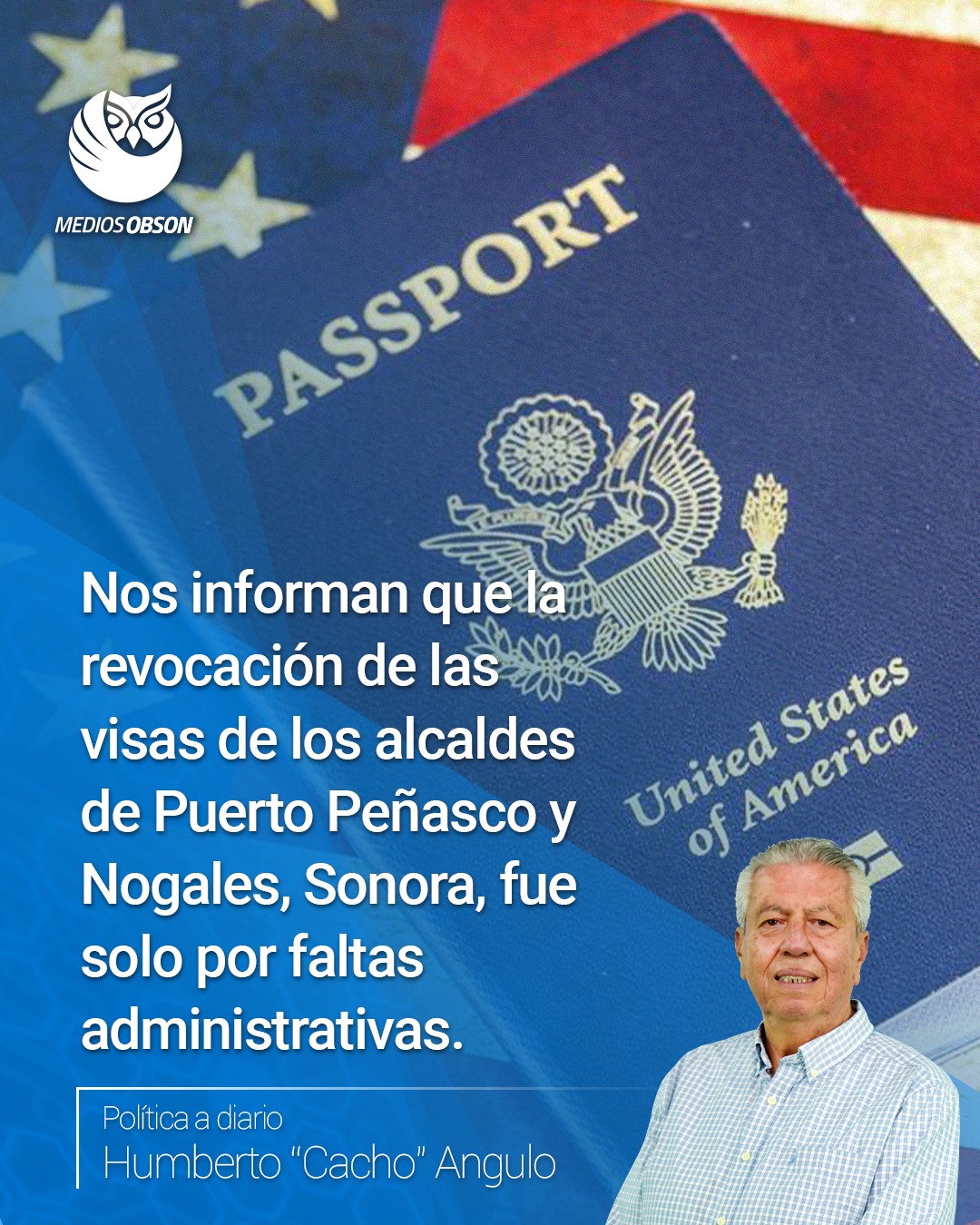 Nos informan que la revocación de las visas de los alcaldes de Puerto Peñasco y Nogales, Sonora, fue solo por faltas administrativas, esto es desde una multa de transito que no se presentó a pagar en tiempo y forma o por algún crédito en alguna tienda no cubierto en tiempo y forma, pues de ser por drogas u otra razón mayor, lo hubiesen detenido en la pasada. Pero como algunos medios solo están esperando alguna noticia de este tipo para hacer otro tipo de pronunciamientos, que perjudiquen a su gobernador o su partido Morena…
