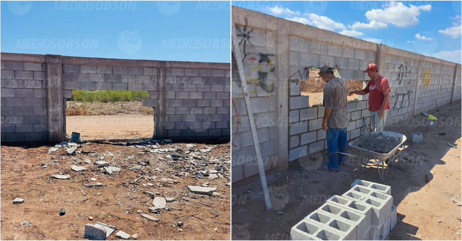 La barda perimetral del Panteón de Pueblo Yaqui fue reparada después de que el pasado domingo 17 de agosto un vehículo se impactara contra la construcción lo que provoco que un pedazo de la barda se derrumbara.