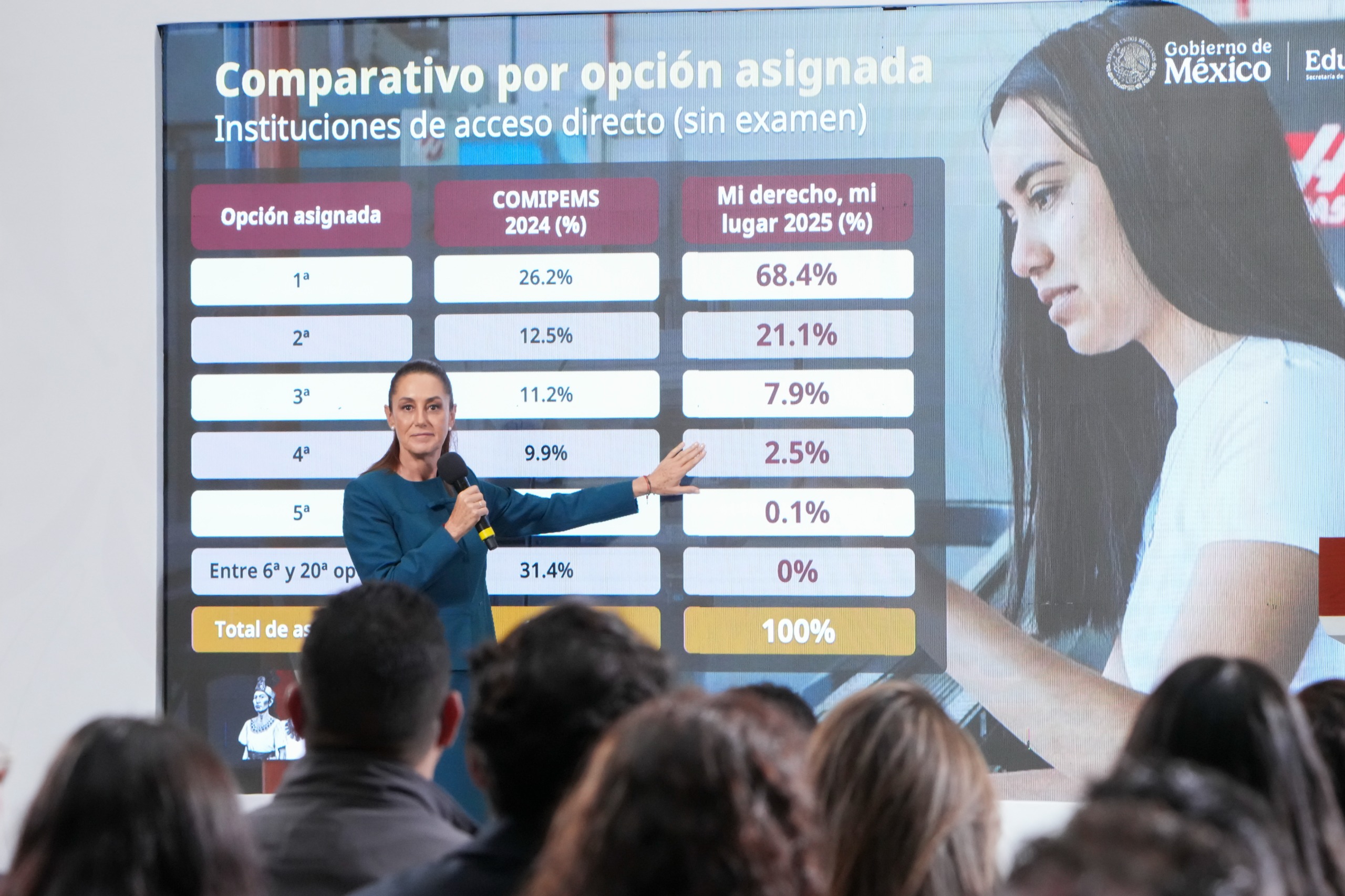 La Presidenta de México Claudia Sheinbaum Pardo destacó que, a través de Mi derecho, mi lugar, en la Zona Metropolitana del Valle de México (ZMVM) se acabaron los jóvenes rechazados en el bachillerato, gracias a que la Secretaría de Educación Pública (SEP) informó que el nuevo mecanismo de acceso a la Educación Media Superior, que dejó atrás al COMIPEMS, permitió que el 97.4 por ciento de los jóvenes eligieran entre su primera y tercera opción.
