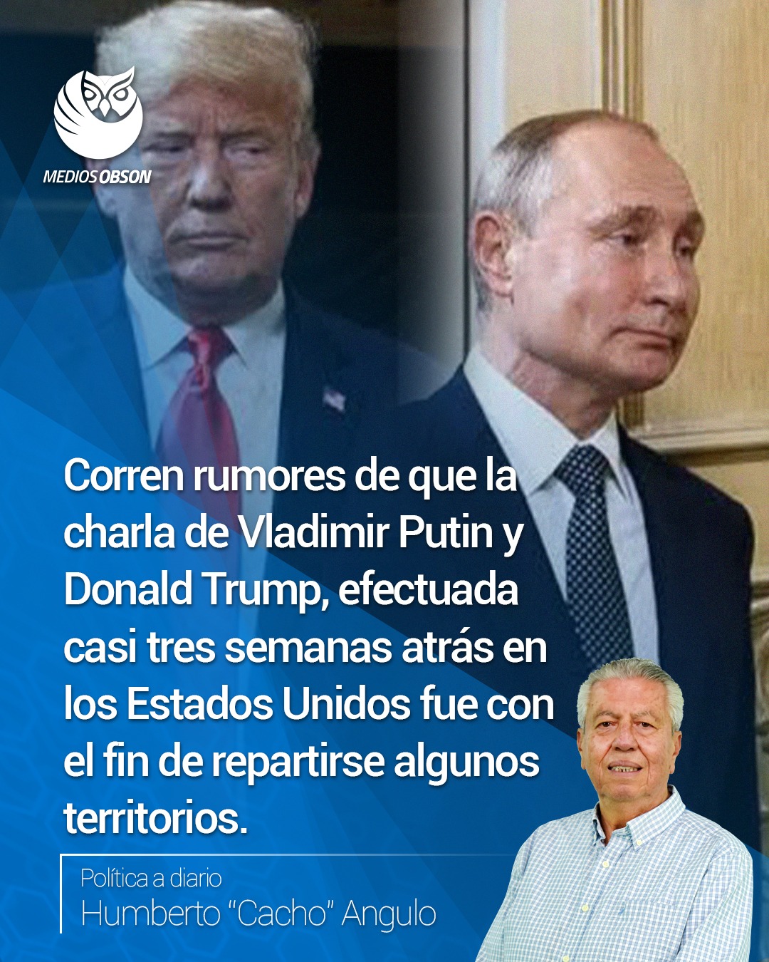 Corren rumores de que la charla de Vladimir Putin y Donald Trump, efectuada casi tres semanas atrás en el estado de Alaska, de los Estados Unidos fue con el fin de repartirse algunos territorios, en principio el mandatario estadounidense, le dijo a Putin, que podría recuperar los países que se le independizaron incluyendo Ucrania completo y que el mandatario Ruso, le respondió que a cambio, ellos no intervendrán en una invasión de los gringos, en los países de izquierda ubicados en América, iniciando por Venezuela…