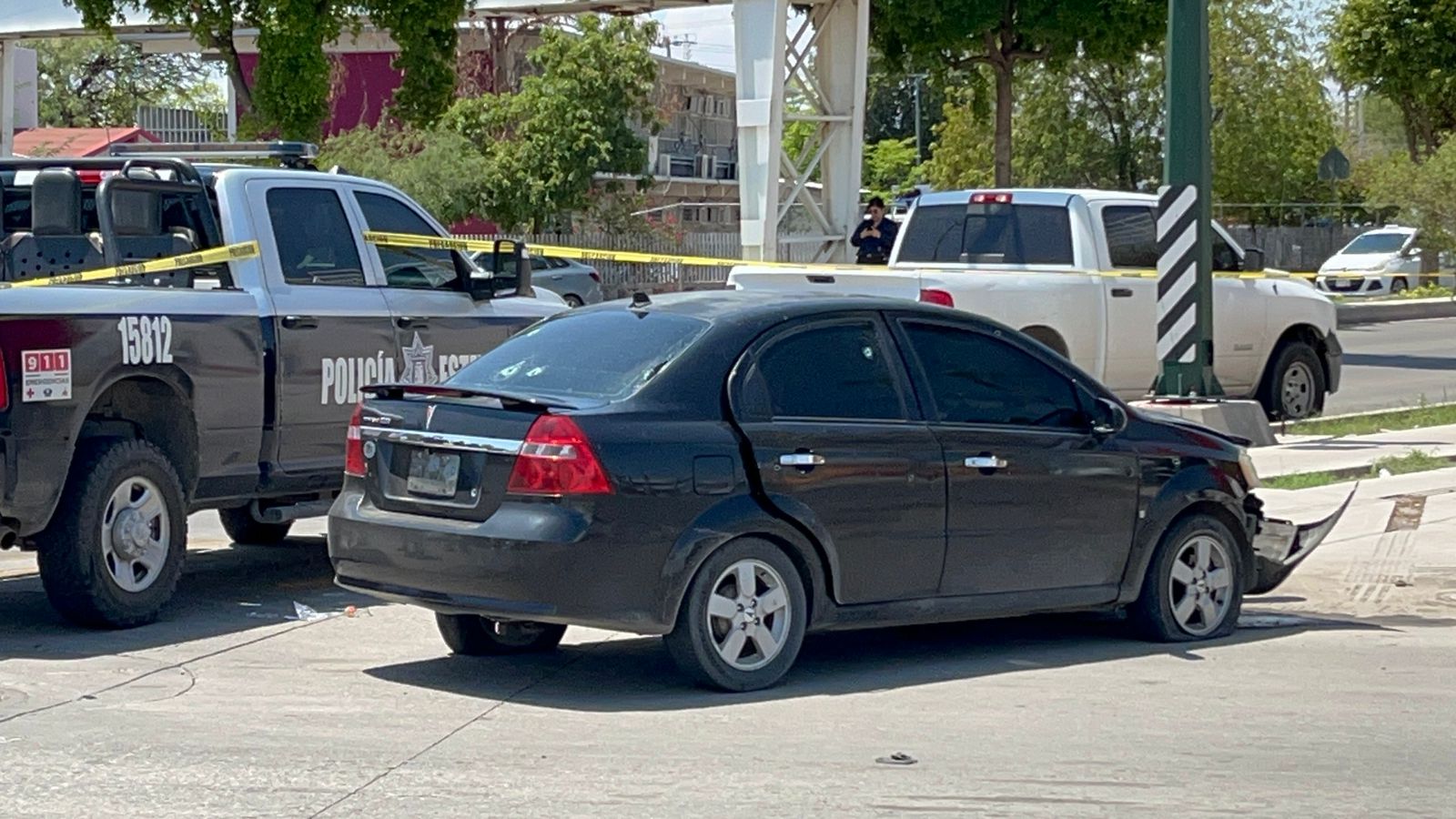 Una intensa persecución por varias cuadras del primer cuadro de la ciudad terminó en un violento ataque armado la tarde de este lunes, cuando un vehículo Pontiac con placas de Sonora se impactó en la esquina de los bulevares Américas y Luis Encinas, presentando al menos 20 impactos de bala en su carrocería.