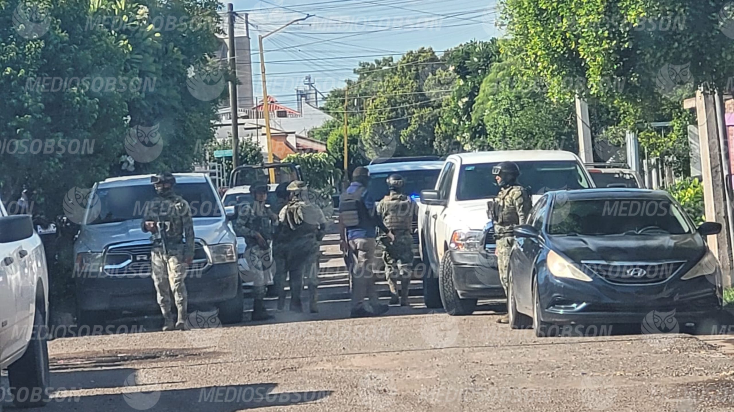 Mientras agentes ministetiales daban cumplimiento a la diligencia judicial policías estatales, municipales e infantes de Marina, se.mamtenian a la expectativa en los alrededores