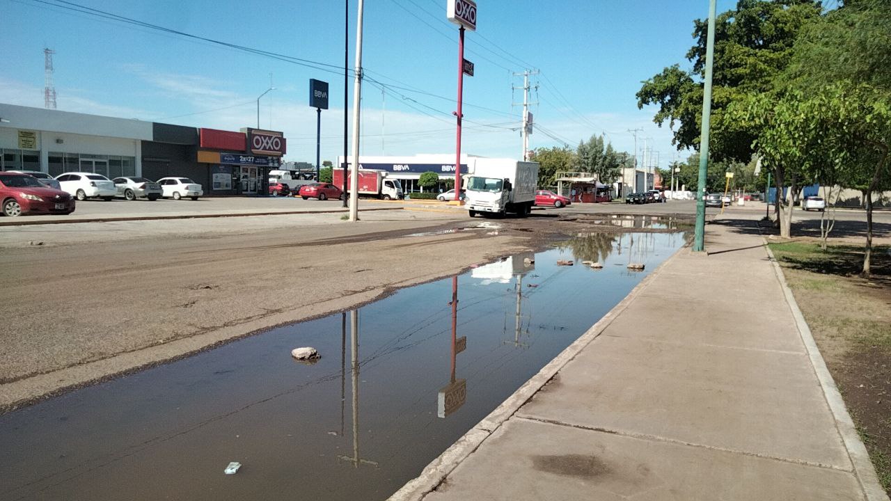 La calle Carlos Conant Maldonado, ubicada entre la Prolongación Miguel Alemán y la avenida Sinaloa, se encuentra en un estado deplorable, con enormes baches llenos de agua que representan un verdadero riesgo para conductores y peatones.