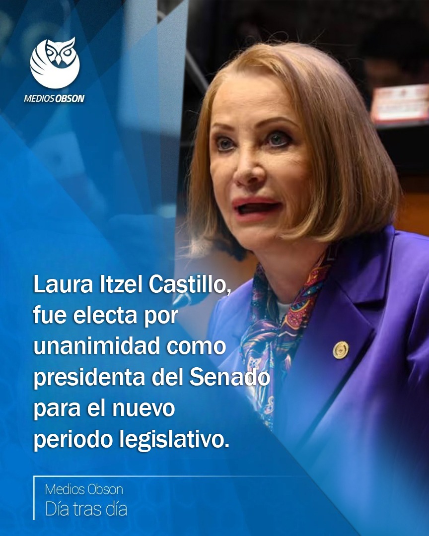 A partir del primero de septiembre la nueva presidenta de la Mesa Directiva del Senado será Laura Itzel Castillo, por lo que sucederá en el cargo a Gerardo Fernández Noroña. La senadora se mantendrá al frente del segundo año de la LXVI legislatura, que abarca el periodo de 2024 a 2027. Así lo confirmó a través de sus redes sociales la legisladora Andrea Chávez donde dijo que ‘en el Grupo Parlamentario de Morena acabamos de aprobar por unanimidad que nuestra propuesta para presidir la Mesa Directiva será la compañera Laura Itzel Castillo’, indicó. Sobre la elección de nueva presidenta del Senado, la presidenta Claudia Sheinbaum reconoció la trayectoria de Laura Itzel Castillo. Una gran luchadora social’, afirmó la presidenta Claudia Sheinbaum sobre el anuncio de Laura Itzel Castillo. Es hija de Heberto Castillo.