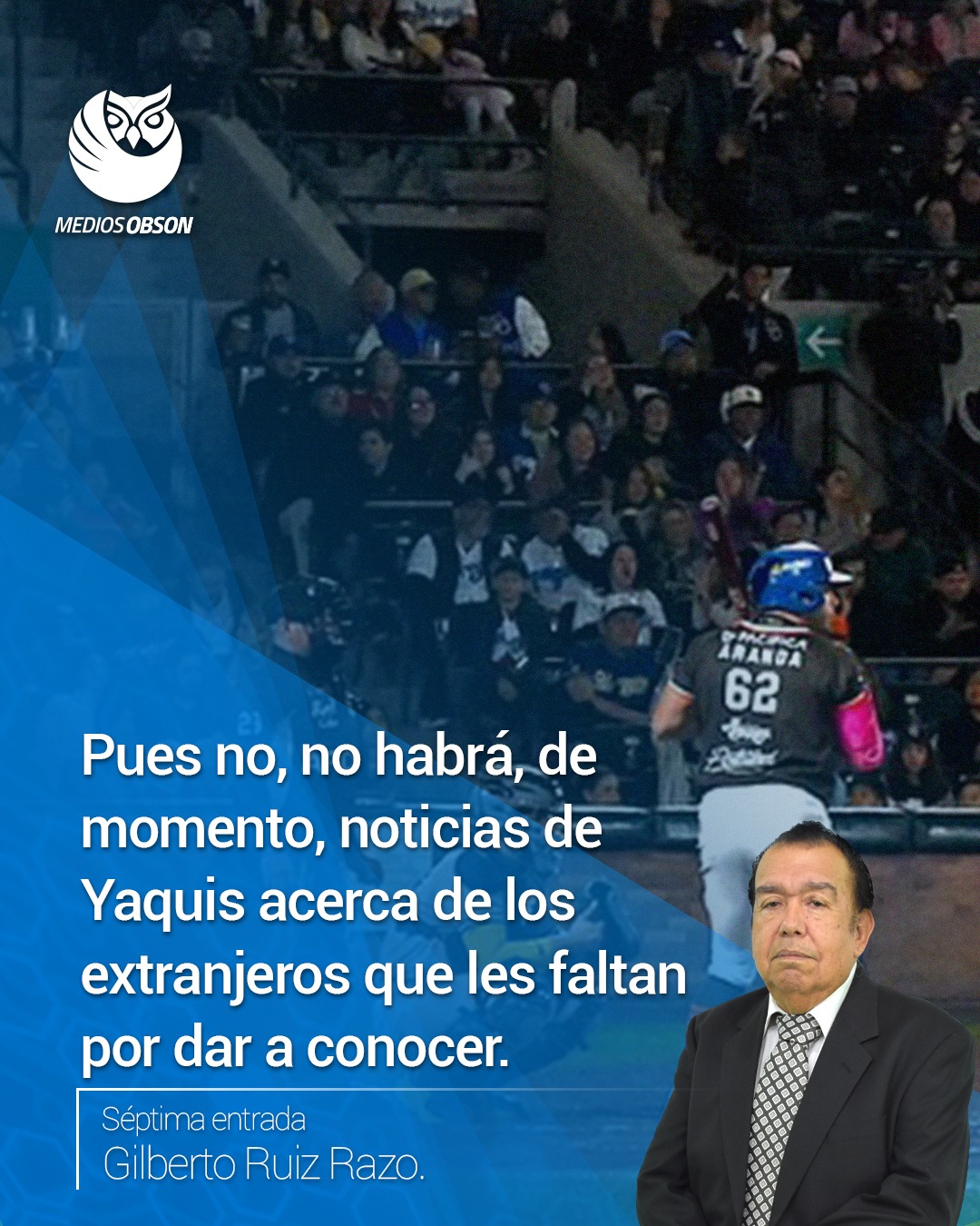TARDAN.- Pues no, no habrá, de momento, noticias de Yaquis acerca de los extranjeros que les faltan por dar a conocer. Por palabras de René Arturo Rodríguez, presidente de la tribu, será dentro de varios días más, ya que están esperando que sea el propio manejador Gabe Álvarez, quien recomiende a la mayoría de los importados que serán un total de cinco, dado que ya dieron a conocer a tres de los refuerzos.