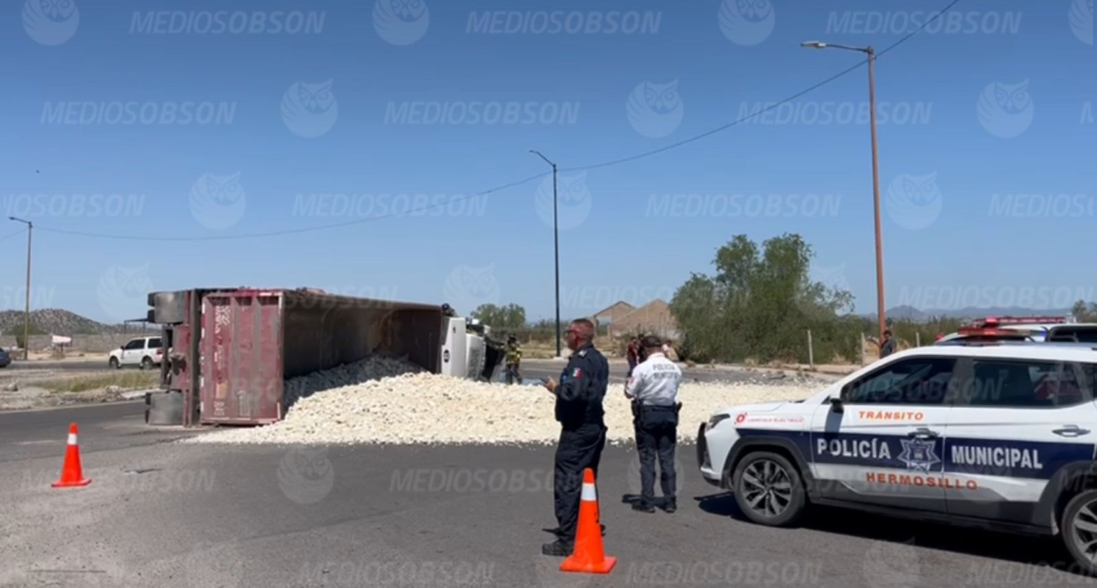 Hermosillo, Sonora; agosto de 2025.- La mañana de este sábado se registró la volcadura de un vehículo de carga que transportaba varias toneladas de piedra caliza, en hechos ocurridos al sur de Hermosillo, sobre el bulevar Jahudiel Zamorano.