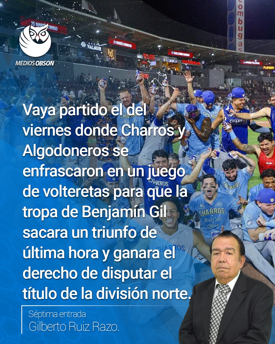 CARDIACO.- Vaya juego el del viernes por la noche donde Charros y Algodoneros se enfrascaron en un juego de volteretas para que la tropa de Benjamín Gil sacara un triunfo de última hora y ganara el derecho de disputar el título de la división norte.