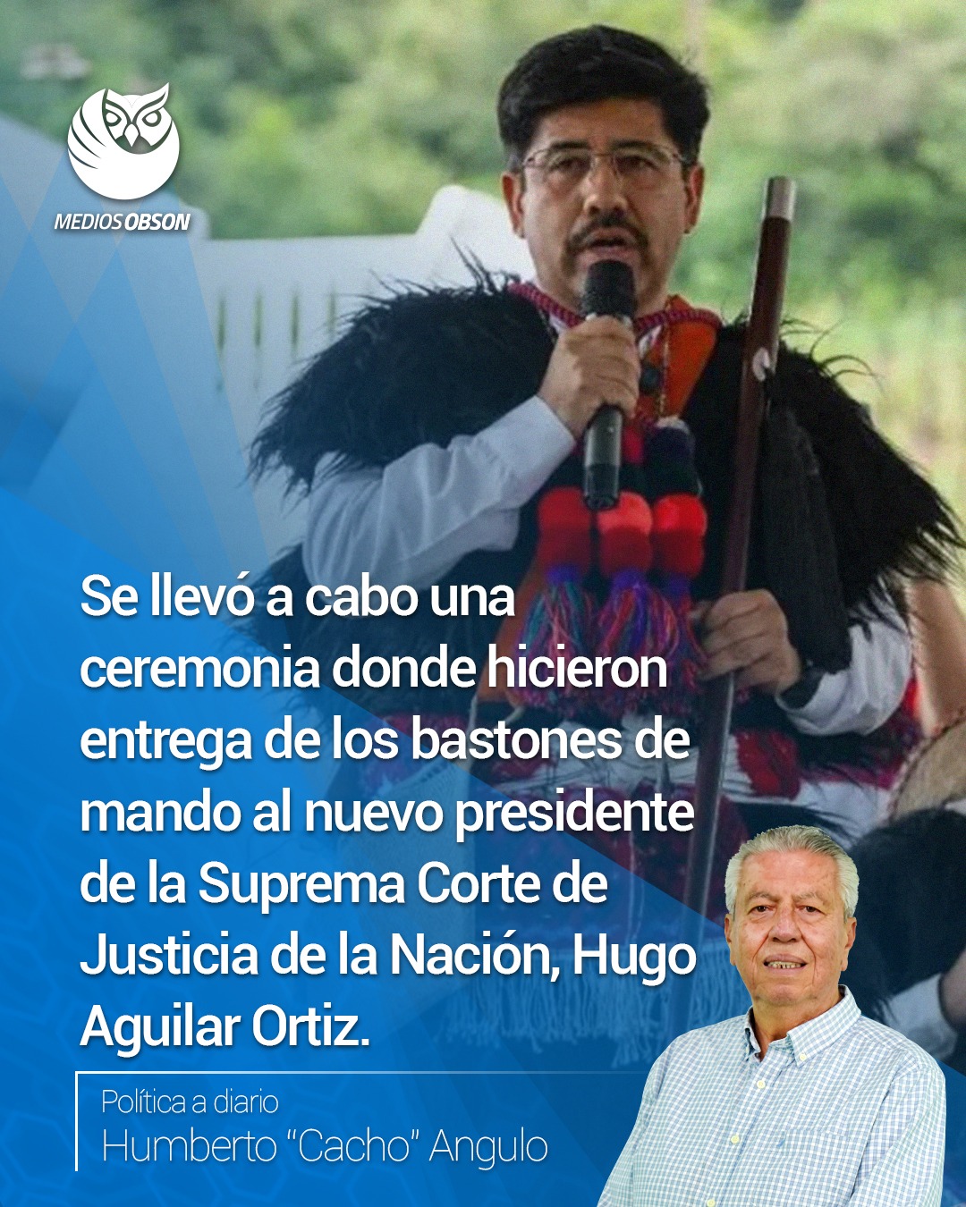 Ayer por tarde se llevó a cabo una ceremonia hicieron entrega de los bastones de mando, a el nuevo presidente de la Suprema Corte de Justicia de la Nación, HUGO AGUILAR ORTIZ, la primera corte electa por el pueblo, decían en la plancha del Zócalo, para posteriormente tomar la protesta de la nueva SCJN, en el pleno de los Senadores y posteriormente tomar sus instalaciones en la SCJN. HUGO AGUILAR anduvo en el estado de Sonora, formando el Plan de Justicia Yaqui.