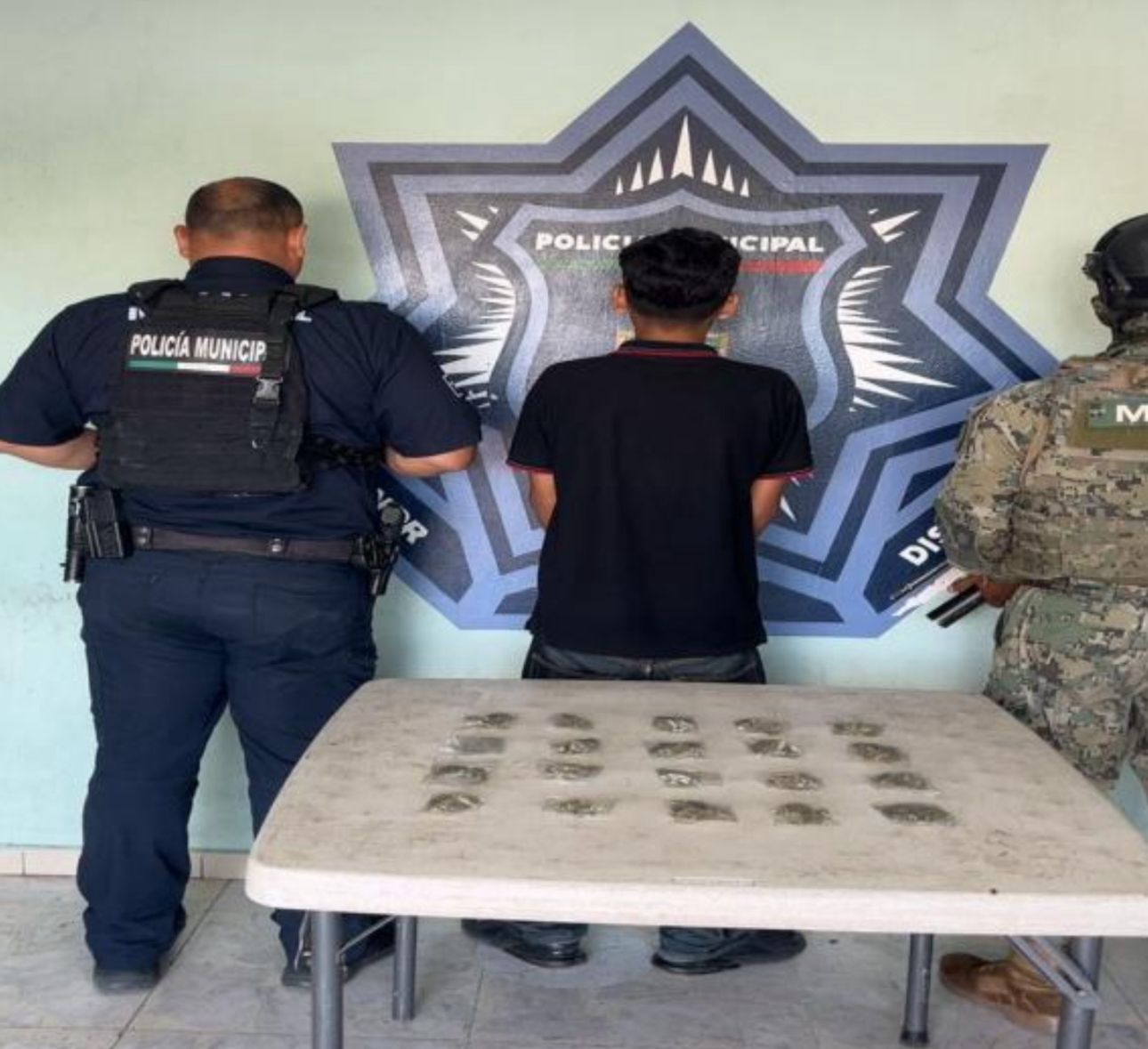 Fue durante un operativo de vigilancia en la calle Kino y Calzada Ostimuri, de la colonia Villas del Náinari, cuando los elementos de la SSPM y Marina, detuvieron a Pablo Gael “N.”, de 16 años de edad, a quien se le aseguraron 20 envoltorios que contenían una hierba seca y verde con características similares a la mariguana, por lo que fue detenido por la probable comisión del delito contra la salud.