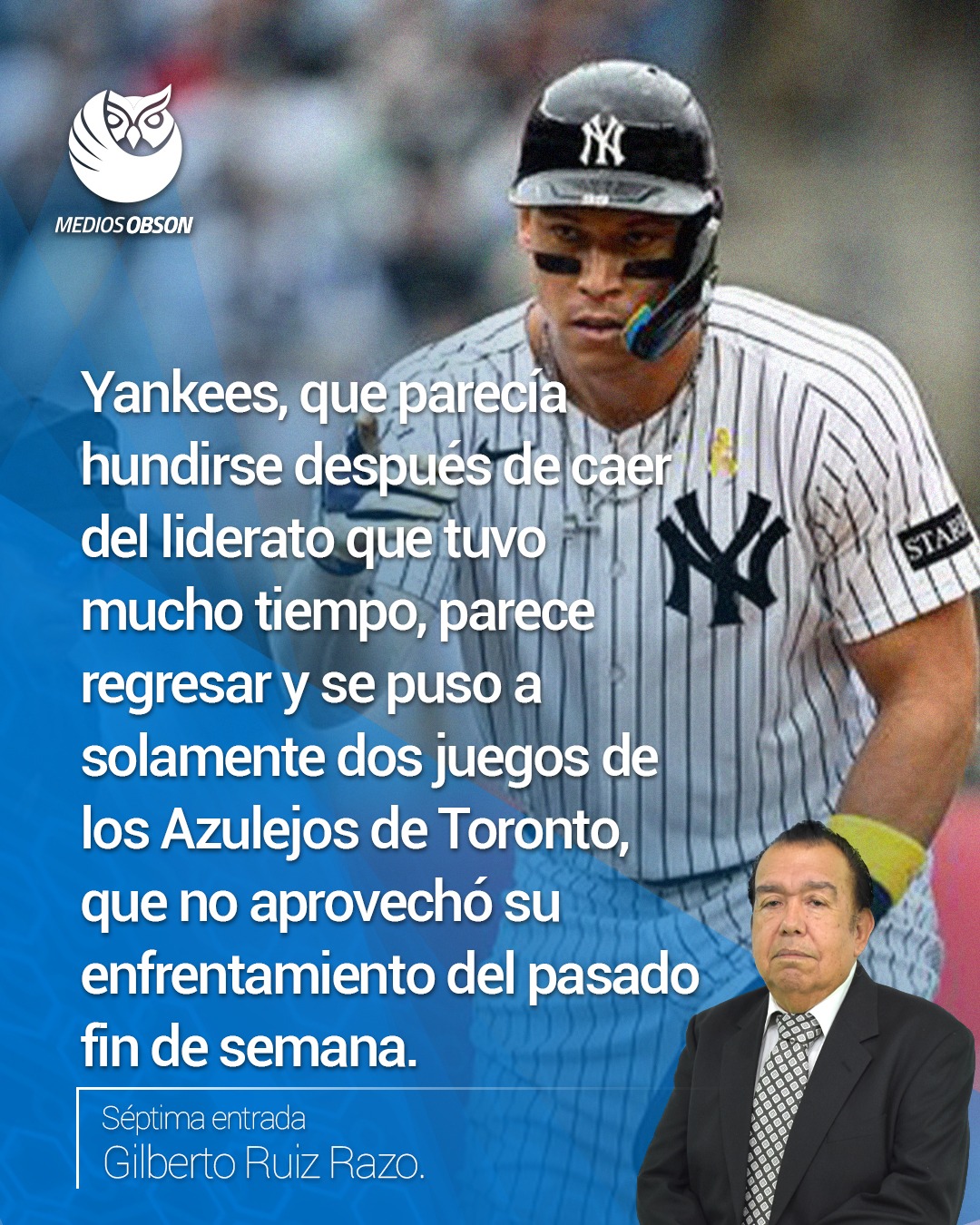 REGRESA.- Yankees, que parecía hundirse después de caer del liderato que tuvo mucho tiempo, parece regresar y se puso a solamente dos juegos de los Azulejos de Toronto, que no aprovechó su enfrentamiento del pasado fin de semana cuando enfrentaron a los dirigidos por Aaron Boone. Veremos. LUEGO SEGUIMOS