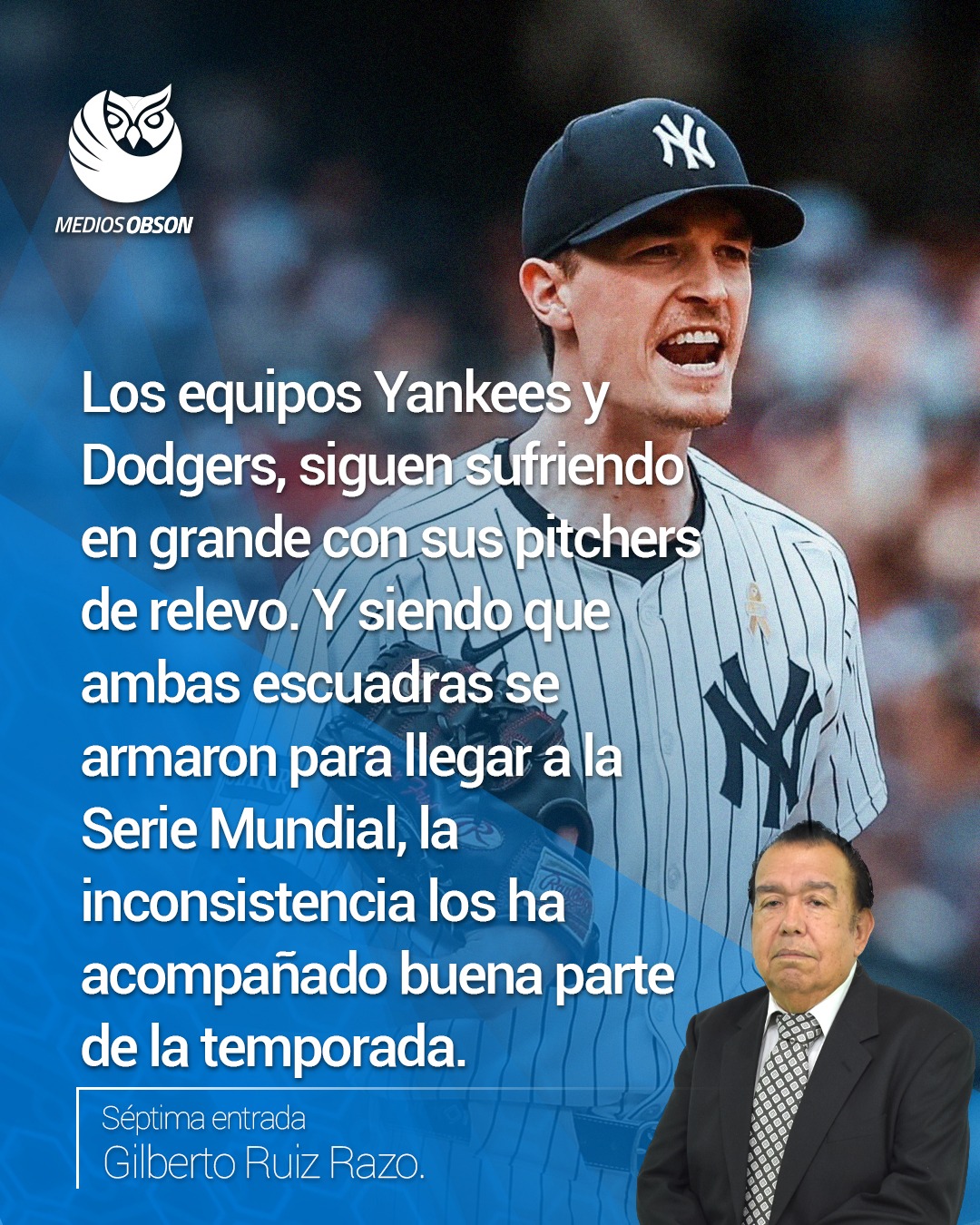 RELEVOS.- Los equipos Yankees y Dodgers, siguen sufriendo en grande con sus pitchers de relevo. Y siendo que ambas escuadras se armaron para llegar a la Serie Mundial, la inconsistencia los ha acompañado buena parte de la temporada. Dodgers parece seguro de estar en los play offs, no así Yankees que, de no seguir sumando triunfos, podría quedar fuera.