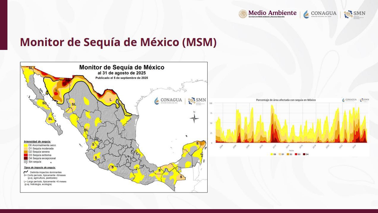 El informe, con corte al 31 de agosto, también señala una reducción en la superficie estatal afectada por algún grado de sequía, que pasó de aproximadamente 98.2% a 84.9%.