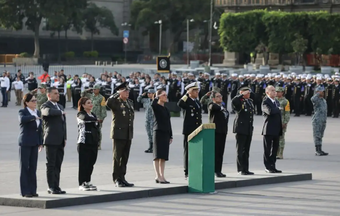 Desde Palacio Nacional, acompañada de la jefa de Gobierno de la Ciudad de México, Clara Brugada, fue escoltada por los titulares de el secretario de la Defensa Nacional, Ricardo Trevilla, de Marina, Raymundo Morales; de Gobernación, Rosa Icela Rodríguez, de Seguridad y Protección Civil, Omar García Harfuch. A las 7:19 comenzó el izamiento del lábaro patrio.