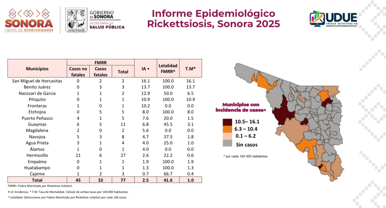 En el caso particular de Sonora, a la semana 34 de 2025 se registraban 64 casos confirmados de fiebre manchada, de los cuales 14 resultaron en defunciones, lo que refleja una letalidad del 20%. A nivel nacional, en el mismo corte, se contabilizaron 276 casos y 62 defunciones, con una letalidad del 23%.