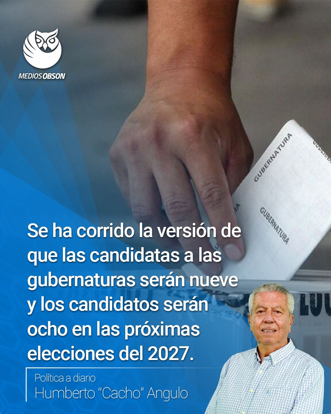 Se ha corrido la versión de que las candidatas a las gubernaturas serán nueve y los candidatos serán ocho, incluso hay quien va más allá al especular de que a casi a año y medio de que sepamos esos nombres, la presidenta CLAUDIA SHEINBAUM PARDO a fin de frenar un poco, estas especulaciones, ordenó a los coordinadores de las bancadas del los Diputados Federales y Senadores del partido Morena, se impidiera que familiares hasta cuarto grado, de los actuales funcionarios heredarán sus posiciones a estos miembros de sus familias, a partir del proceso electoral del 2027.