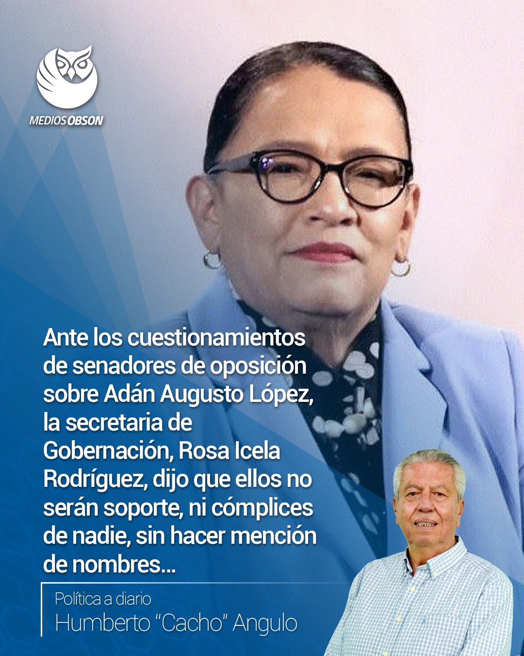 La secretaria de Gobernación ROSA ICELA RODRÍGUEZ, asistió a la glosa al Senado de la República y el excandidato a la Presidencia de la República por el PAN en el ante pasado proceso electoral, RICARDO ANAYA. Y lo mismo la legisladora priista que hizo los mismos señalamientos, estos sobre los señalamientos en contra del coordinador de la bancada de los senadores de Morena ADÁN AUGUSTO LÓPEZ HERNÁNDEZ. La secretaria de Gobernación en su mensaje dijo que ellos no serán soportes, ni cómplices de nadie, obvio sin hacer mención de nombres…
