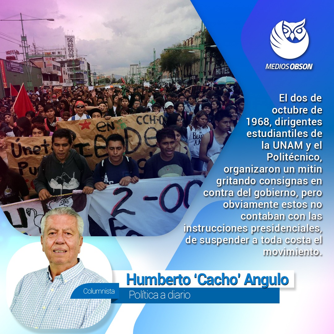 El dos de octubre de 1968, los dirigentes estudiantiles de la UNAM y el Politécnico, organizaron un mitin con la idea de posterior a este, dirigirse en una gran marcha, todos unidos gritando consignas en contra del gobierno, pero obviamente estos no contaban con las instrucciones presidenciales y la policía del DF, de suspender a toda costa.