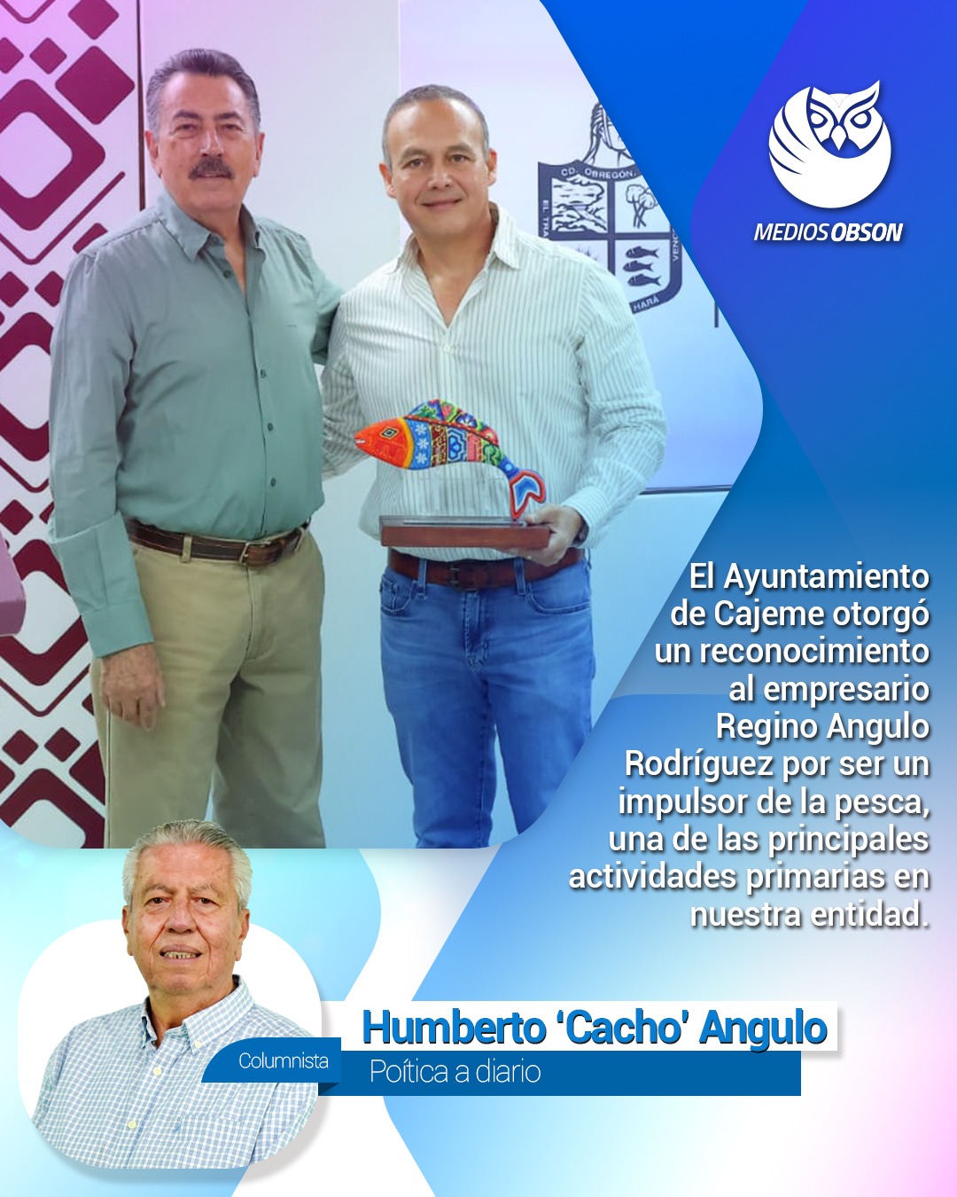 El H. Ayuntamiento de Cajeme otorgó un reconocimiento al empresario REGINO ANGULO RODRÍGUEZ por ser un impulsor de la pesca, una de las principales actividades primarias en nuestra entidad, pero es de los pocos que le da seguimiento a sus productos, pues es un industrial que si hubiese otros empresarios como él que le dieran la transformación a nuestros productos primarios, otra sería la situación de Sonora y los sonorenses, ya que no es posible que seamos el primer productor de algunos productos, ganaderos, mineros por citar solo algunos de ellos. El alcalde JAVIER LAMARQUE CANO, quien está preocupado por que nuestros productos se procesen en la entidad y ya trabaja en ello, iniciando por el reconocimiento de este industrial…