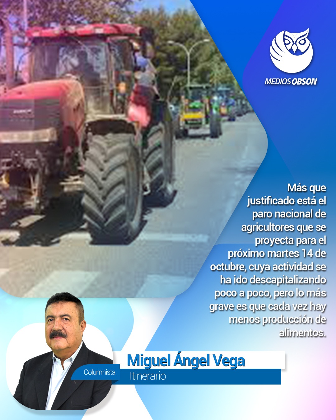 Más que justificado está el paro nacional de agricultores que se proyecta para el próximo martes 14 de octubre, toda vez que una gran realidad es que desde el primer día del gobierno de ANDRÉS MANUEL LÓPEZ OBRADOR, los agricultores del país, han sido ignorados, lo que ha originado que la actividad se vaya descapitalizando poco a poco, pero lo más grave es que cada vez se produzca menos de los alimentos que consumimos. Fue una verdadera utopía aquel cuento chino que lanzaba AMLO a los aires cada vez que agarraba el micrófono en lugares públicos en su campaña, en el sentido de que al llegar al gobierno buscaría lograr la tan añorada autosuficiencia alimentaria. Cuando en la práctica vimos un claro y muy pronto que en su gobierno se le dio prioridad con apoyos tipo limosnas a los agricultores de autoconsumo, pero a los productores que cosechan año con año, ciclo por ciclo, temporada tras temporada, los alimentos que consumimos en nuestras mesas, los fue ignorando olímpicamente. Esto obligó a que productores de estados como Sinaloa, Sonora, Guanajuato, Veracruz y Michoacán, entre otros, levantaran la voz, por eso ya dijeron que se sumarán a esta movilización, porque realmente ya no aguantan esta situación que los carga por la calle de la amargura, en tanto al gobierno le sigue valiendo una pura y dos con sal. Y esto se resume muy fácil, porque los insumos para producir están por las nubes, pero inexplicablemente los precios de sus cosechas siempre están por los suelos. Y la realidad los acorrala todos los días, porque ya no hay ningún apoyo real de políticas públicas. Y es que fertilizantes, semillas, agroquímicos y la maquinaria, todo ha subido los precios que dan miedo, pero cuando cosechan les quieren pagar una limosna por lo que les costó tanto trabajo producir. Por lo anterior, se está haciendo un llamado a la población a parar actividades, cero ventas, cero compras, cerrar oficinas y no como un acto de rebeldía, sino como un grito de desesperación, porque si el campo se detiene, se paraliza todo el país. Y si usted que no es agricultor cree que esta situación del campo no le afecte, está muy equivocado, toda vez que detrás de cada fruta, cada tortilla, cada taco, cada verdura, que nos comemos hay miles de familias que trabajan para hacer llegar esos productos a nuestros hogares. Por eso es importante ofrecer todo el apoyo a los agricultores, toda vez que de lo contrario, entre más mal le vaya al campo, con el tiempo, mas mal no irá a todos, porque en lugar de irnos acercando a la autosuficiencia alimentaria, nos estamos alejando cada día más y por lo tanto el país tendrá que importar todos los alimentos que consumimos, obviamente más caros y de menos calidad, por eso la importancia de que vuelva la bonanza al campo mexicano. Y si quiere saber lo que hay en el fondo de todo esto, se lo diremos. Al gobierno federal le interesa que cada día truenen más agricultores, para que cada vez haya más pobres, que se vean obligados a aceptar las limosnas que les tiran mediante los programas sociales y tenerlos como votos cautivos en tiempos de elecciones, porque es evidente que las intenciones son convertir a México en una dictadura, como ocurre en Cuba, Venezuela, Nicaragua, donde la población sufre la consecuencias de haberse dejado manipular y no parar las intenciones nefastas de líderes comunistas, como FIDEL CASTRO y HUGO CHÁVEZ, que dejaron a sus país en la desgracia antes de morirse, por eso la importancia de salir al apoyo de los agricultores…………….. EDITH AVILA, economista de la Universidad Panamericana, dice que este el presupuesto para Ciencia y Tecnología, sufrió un recorte nada menos que de 7 mil millones de pesos, en tanto a las obras faraónicas de ANDRES MANUEL LOPEZ OBRADOR, le seguimos destinando decenas de miles de millones de pesos, después de lo caras que salieron y además inútiles……………. Y si usted les creyó a los morenistas aquel mensaje de que combatirían el nepotismo, lea esto: El hoy coordinador de los diputados de Morena en la Cámara de Diputados, RICARDO MONREAL ÁVILA, fue gobernador de Zacatecas, luego le siguió su hermano DAVID MONREAL ÁVILA, que está actualmente en el poder en esa entidad y para que se lo sepa ahora su hermano más chico, SAÚL MONREAL ÁVILA, anda con todo para buscar la gubernatura de ese mismo estado, lo que indica que ya nada mas falta que pongan a Zacatecas a nombre de ellos. Pero, por si eso le parece poco, la hija de Ricardo Monreal, EDNA CATALINA MONREAL PÉREZ se la jugó para alcaldesa de la Delegación Cuauhtémoc, donde la hizo morder el polvo la actual alcaldesa ALESSANDRA ROJO DE LA VEGA. Con la suerte para Caty Monreal que solo una semana duró desempleada porque inmediatamente la jalaron del Gobierno Federal, donde la colocaron como directora general del Instituto Nacional de Economía Social (INAES), con un ‘sueldito’ de 124 mil pesos mensuales ‘Hay pa’los chicles’…………Nos dejó con los ojos cuadrados la columna del compañero del Universal, HÉCTOR DE MAULEÓN, sobre todo en el primer párrafo donde dice, palabras más palabras menos, que algo anda mal en la Agencia Ministerial de Investigación Criminal (AMIC) en Sonora, porque el jefe actual CARLOS ALBERTO FLORES, durante el llamado ‘Culiacanazo’ que todos conocimos en su momento en el 2019, el hombre había tenido la responsabilidad operativa de dar seguimiento a nada menos que el caso de OVIDIO GUZMÁN LÓPEZ, desde una semana antes que ocurriera el hecho, que sin duda representó una afrenta mundial, el haber liberado a un presunto narco de ese tamaño. Con esta información y atando unos cuantos cabos, podemos sacar conclusiones sobre actos cometidos por elementos de la corporación que se han convertido también en escándalos públicos, claro no del tamaño del ‘Culiacanazo’, pero que sí afectan a la ciudadanía. Ahí se la dejamos para su análisis………….Desde