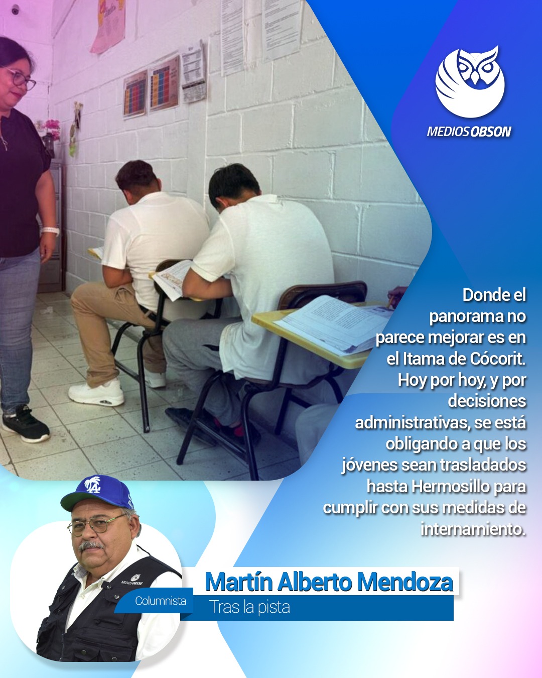 DE MAL EN PEOR PANORAMA EN ITAMA DE CÓCORIT; QUIZÁS A MUCHOS NO LES INTERESA, PERO PARA OTROS ES UN TODO; INSISTEN EN TRASLADAR A LOS ADOLESCENTES A HERMOSILLO PARA QUE CUMPLAN CON MEDIDAS DE INTERNAMIENTO; SIN EMBARGO, SURGE LA PREGUNTA ¿CÓMO SE PUEDE HABLAR DE REINSERCIÓN SI EL PRIMER PASO ES ARRANCARLOS DE SUS FAMILIAS Y DE SU ENTORNO?; EN CASO DE LOS ADOLESCENTES NO SE TRATA DE CASTIGAR, SINO DE REEDUCAR, BRINDAR, BRINDAR HERRAMIENTAS Y ABRIR CAMINOS QUE LES PERMITAN ENCONTRAR FORMAS DE VIDA; CADA KILÓMETRO QUE SE LES ALEJA DE CAJEME ES TAMBIÉN UN KILÓMETRO QUE SE LES SEPARA DE SUS PADRES Y HERMANOS; DEBE TOMARSE EN CUENTA QUE FAMILIAS NO PUEDEN COSTEAR VIAJES A LA CAPITAL DEL ESTADO; CONTRARIO A ELLO VAN A GENERAR UNA RUPTURA DEL LAZO INDISPENSABLE PARA LA RECONSTRUCCIÓN EMOCIONAL; EN CÓCORIT SE CUENTA CON INSTALACIONES QUE DEBEN ADECUARSE A NUEVOS TIEMPOS; SI LEYES AVANZAN INSTITUCIONES DEBEN HACER LO MISMO; TIENEN QUE BUSCAR ALTERNATIVAS Y CONSTRUIR SOLUCIONES REALES POR EL BIEN DE LA JUVENTUD; CONFIRMA FISCALÍA ESTATAL QUE DETENIDOS EN VALLE DORADO APARECEN COMO PRESUNTOS AUTORES DE ATAQUE ARMADO EN POSADA DEL SOL; ENTRE ELLOS SE ENCUENTRA UNA MUJER; HONDO REPUDIO EN SSPM POR RETORNO DE ADÁN VALENZUELA Y DE LUZANILLA HERRERA; MIENTRAS FISCAL SALAS CHÁVEZ SE REFUGIA EN OPACIDAD Y MUTISMO FAMILIAS COMO LA DE ARMIDA GUADALUPE ROMERO, CONTINÚAN ESPERANDO RESPUESTAS