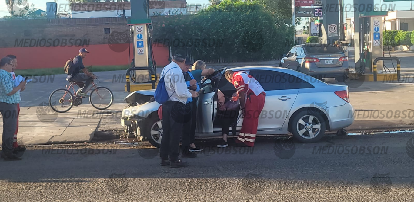 Paramédicos de Cruz Roja atendieron a señora, debido a los golpes que sufrió, cuando el vehículo que conducía fue chocado por otro que no hizo alto, en Miguel Alemán y Náinari.