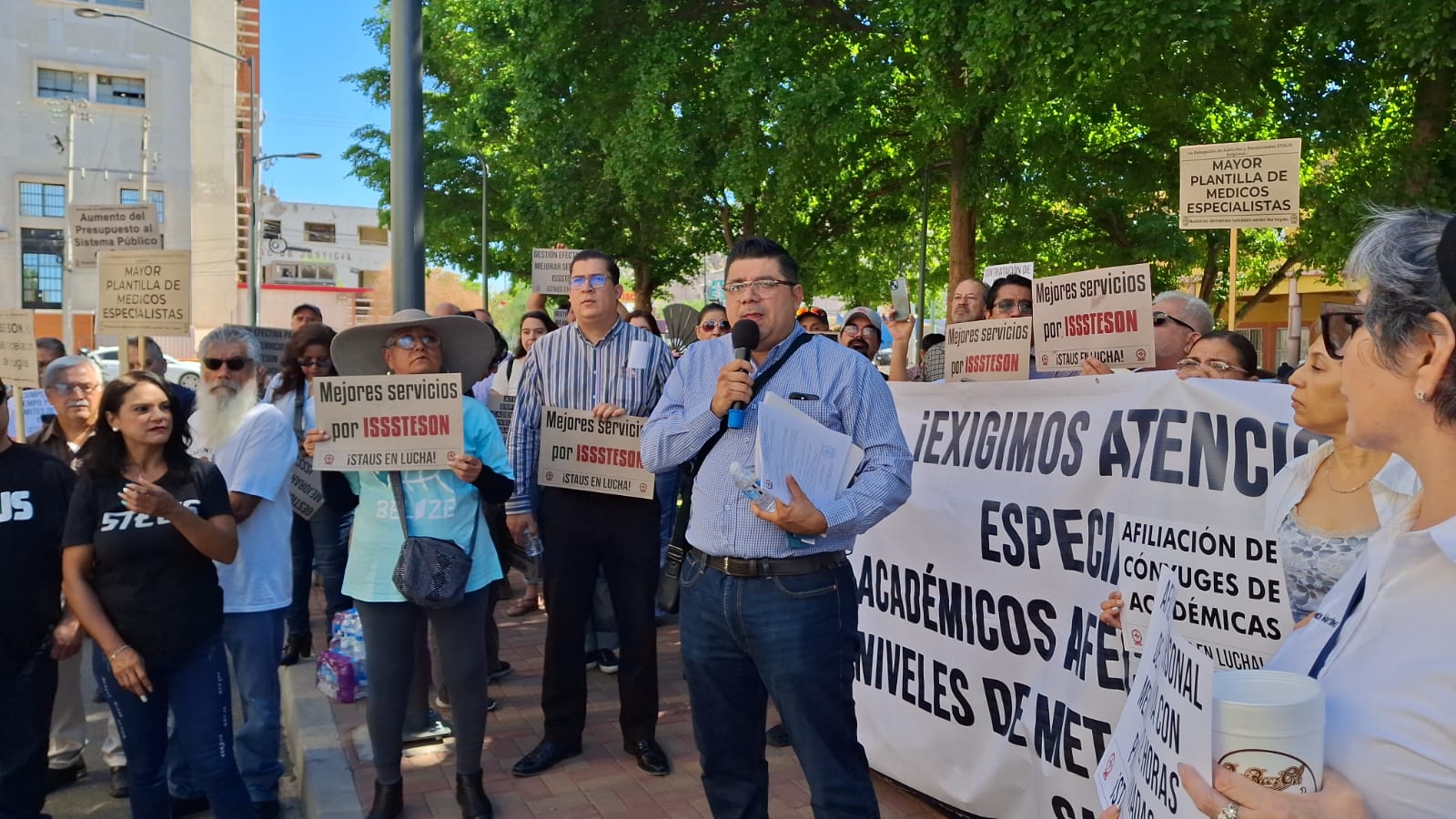 Integrantes del Sindicato de Trabajadores Académicos de la Universidad de Sonora (Staus) realizaron una manifestación en las oficinas de Isssteson, para exigir mayor eficiencia en la atención médica para sus agremiados.