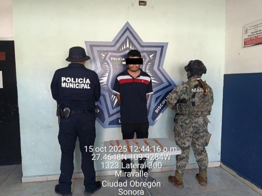 A través de recorridos de vigilancia elementos de la Secretaría de Seguridad Pública Municipal en conjunto con Marina, realizaron la detención de una persona del sexo masculino en el Valle del Yaqui, asegurando diversas dosis de cristal.