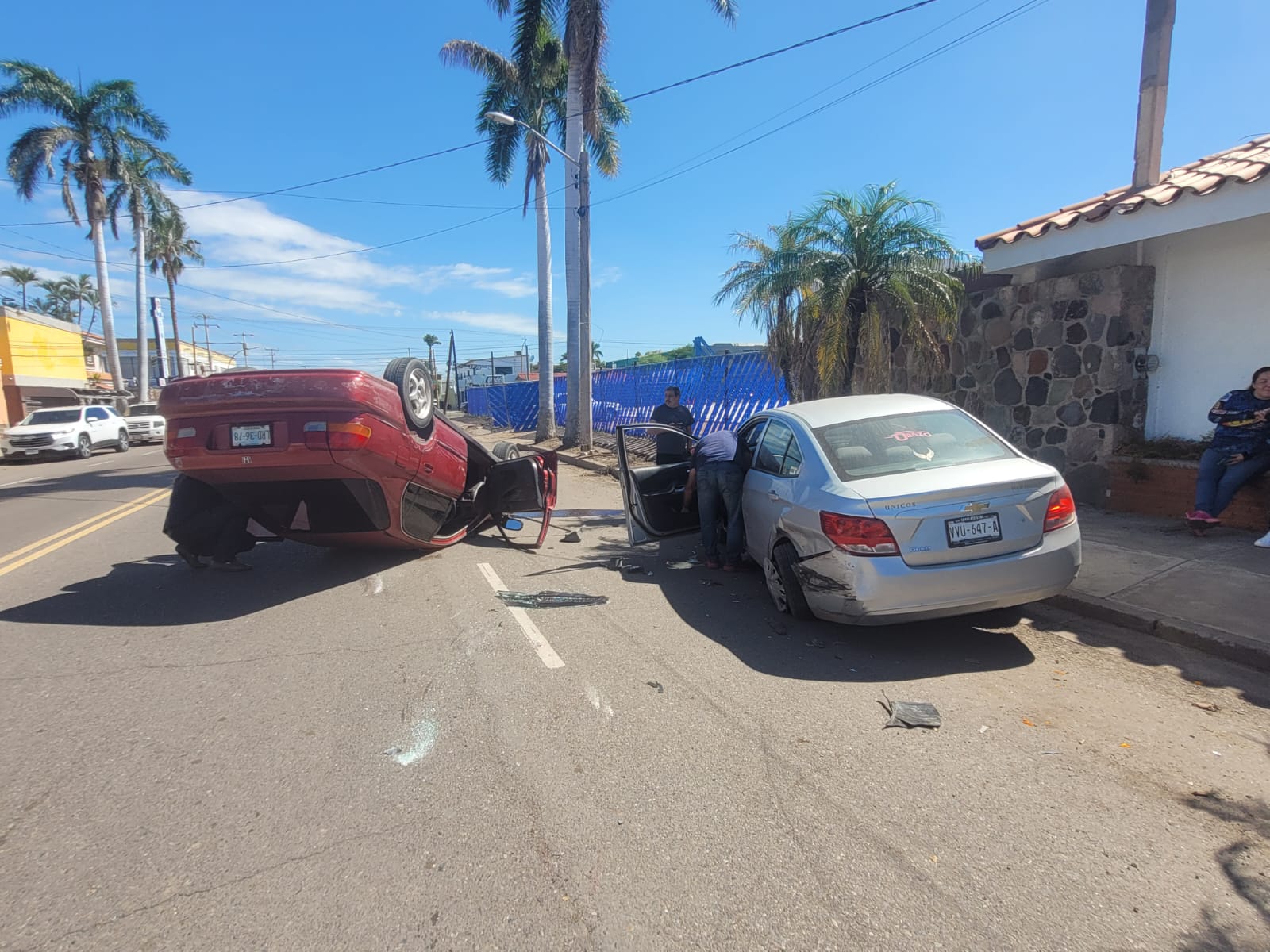 Ligeras lesiones en uno de sus brazos sufrió joven mujer, cuando el vehículo que conducía chocó con automóvil estacionado y volcó.