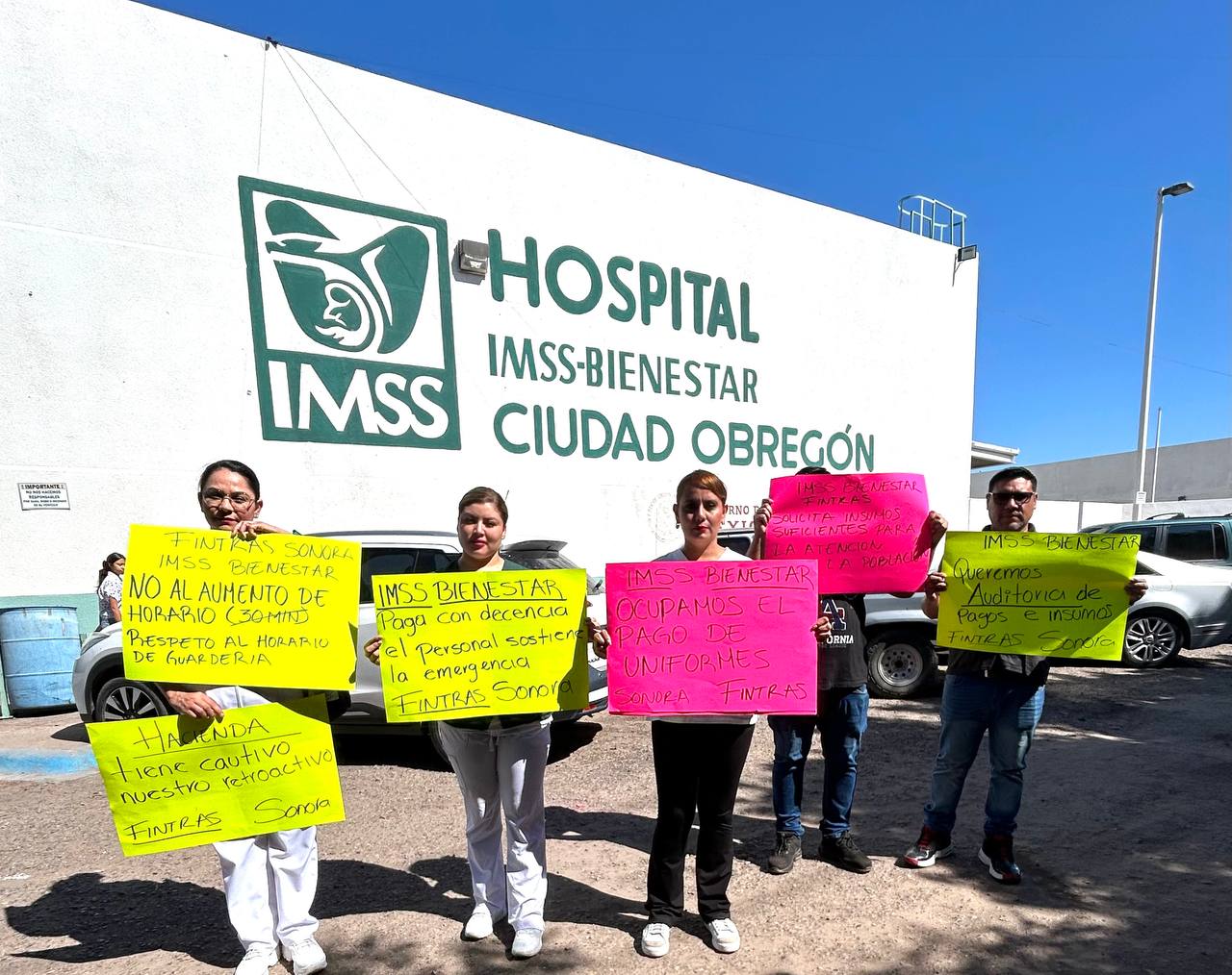 Con cartulinas coloridas con escritos solicitando mejores condiciones salariales e insumos para poder prestar sus servicios de manera eficiente, empleados del Hospital IMSS bienestar pertenecientes al sindicato Fuerza independiente de trabajadores de la salud (Fintras), se manifestaron por fuera de dicho centro médico ubicado en Ciudad Obregón.