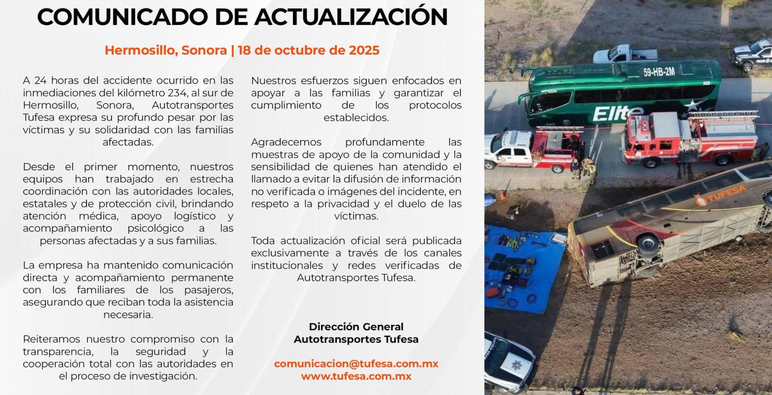La empresa de transporte Tufesa emitió un segundo comunicado tras el accidente al sur de Hermosillo, en el cual expuso que se ha mantenido acompañamiento con los familiares de los pasajeros, así como disposición para cooperar en las investigaciones que llevan a cabo las autoridades.