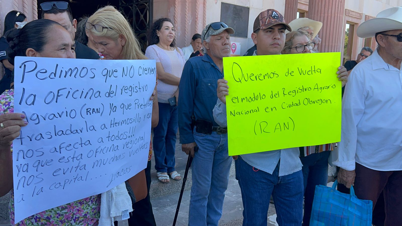 Representantes ejidales del Valle del Yaqui se manifestaron a las afueras de Palacio Municipal, esto debido al cierre de la oficina del Registro Agrario Nacional (RAN) en Cajeme sin previo aviso, por lo que ahora tienen que trasladarse hasta Hermosillo para realizar sus trámites.