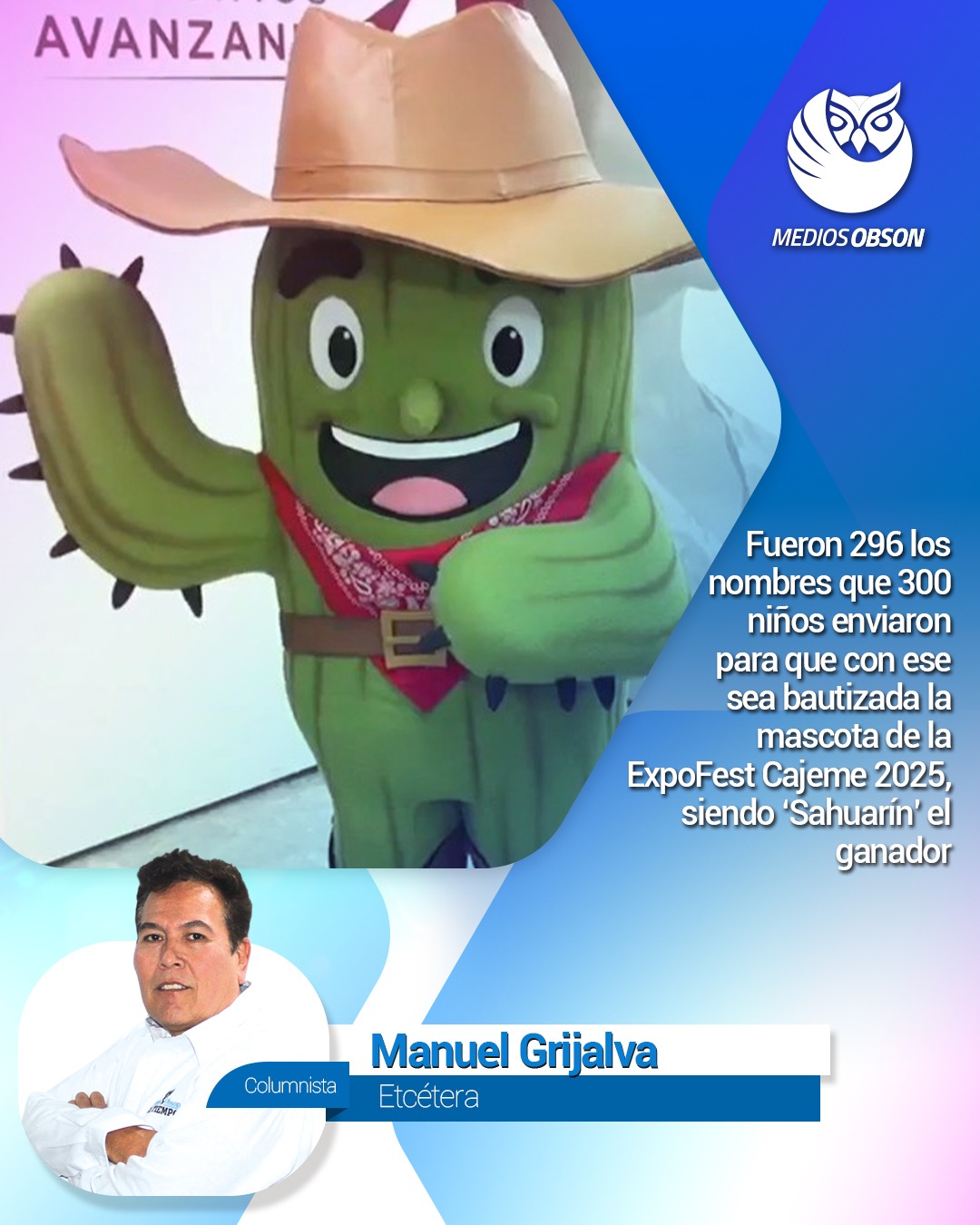 La alegría es gratis, llévala siempre contigo… Según entendí y si mis cuentas no me fallan, fueron 296 los nombres que 300 niños enviaron para que con ese sea bautizada la botarga que será la mascota de la ya muy cercana ExpoFest Cajeme 2025, aquí lo curioso es que 4 niños enviaron la misma propuesta y no creo que se hayan copiado, pues entre ellos no hay parentescos y aunque vivimos en una ciudad chica, ellos nunca antes se han visto, ¡por lo que ni se conocen!… porque el nombre que 4 de los concursantes enviaron por separado es corto, pegajoso, fácil de recordar y medio chistosin es que resultó ser el ganador, así lo informó el señor Víctor Landeros, integrante del Patronato de la ExpoFest Cajeme 2025… como hubo un empate en el primer lugar, los 4 competidores serán reconocidos y premiados tal y como se prometió en la convocatoria, eso el próximo viernes 7 de noviembre a las 5 de la tarde, fecha en la que se llevará la inauguración oficial de la primera edición de la ExpoFest Cajeme 2025… Sahuarín es el nombre que se eligió, más sin embargo, los nombres de los 4 niños que propusieron dicho nombre no han sido divulgados públicamente… todos los ganadores recibirán paquete de cortesías y fotografías con la mascota de la feria, aunque creo que el premio pudo haber sido mucho mejor… nadie me lo dijo, pero sospecho que Ana Victoria Salazar, Ariel Rodríguez, Héctor Gael Cruz son los niños que dijeron que ‘Sahuarín’ era el nombre indicado para la mascota de la feria que está por iniciar, ellos y otro participante más cuya identidad desconozco… Recuerda, procura ser la mano que levanta al caído, y no el pie que lo hunde… Si lo que les gusta es hacer el bien sin mirar a quien les tengo una invitación, la cual es muy fácil de atender, con esta harán felices a muchas personas y es que les harán la vida mucho más llevadera… desde el 18 de septiembre el DIF Cajeme nos invitó a sumarnos a la colecta llamada ‘+Pañales 2025’, campaña que llegará a su fin el último viernes del mes de octubre, aunque la participación ha sido mucha, no ha resultado ser suficiente, pues se necesitan mucho más pañales para poder ayudar a niñas, niños, personas adultas mayores y con discapacidad que necesitan de nuestra ayuda… que les parece si todos hacemos un esfuerzo para sumarnos a esta campaña, que les parece que en lugar de comprar este fin de semana una ‘promo’ o un antojito, mejor compramos un paquete de pañales, estos pueden ser de las etapas 5, 6 y 7, también pañales para adulto, talla mediana y grande, pre doblado y tipo calzón… La vida es mejor cuando nadie sabe qué haces, dónde estás, ni con quién estás… En redes sociales se ha dado a conocer que muy pronto darán a conocer la cartelera artística de la edición número 41 del ‘Festival Alfonso Ortiz Tirado 2026’, evento cultural que cada año se celebra en Álamos, festival cultural que el año que entra dará inicio el viernes 23 y llegará a su fin el sábado 31 de enero… no olvides que cada año en el mes de enero la música llena cada rincón de Álamos con su magia… ¿Qué le falta a la banda ‘El Recodo’ para regresar a ser la agrupación número uno?, ¿qué agrupación tendrá más fans?, ¿‘Intocable’ o grupo ‘Firme’?… Que ironía, no dices nada para evitar conflictos y vives en conflicto por no decir nada… Etcétera…